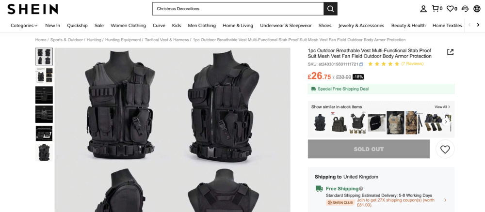 不过,现在在快时尚Shein的购物页面里,经典造型的防刺背心已经卖断货了。