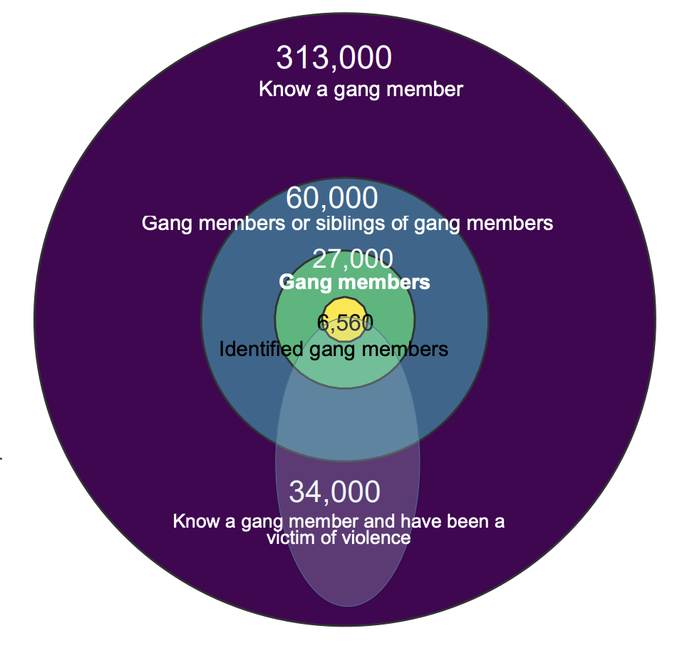 英国国家统计局的犯罪调查数据显示,英格兰约有27000名10至17岁的儿童自认为是帮派成员,而约34000人自称认识帮派成员,且曾是暴力事件的受害者。