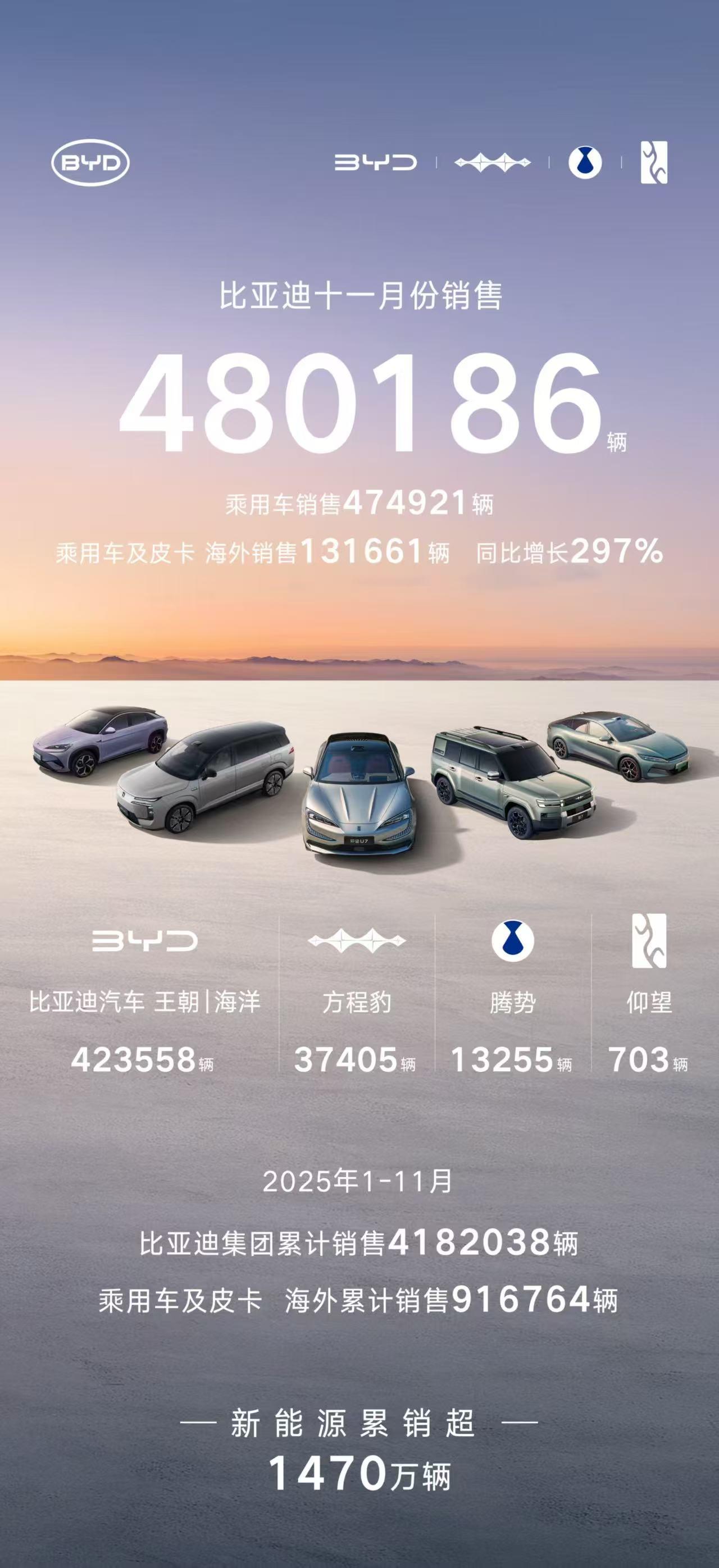 2025年11月,比亚迪销量达48万辆,其中国外销售突破13万辆,国内外销量均创年内新高。2025年1-11月累计销量超418万辆,全年460万辆销量目标已基本确定。 比亚迪不仅是销量领跑者,更是新能源汽车技术的引领者,诸多行业领先技术均由其首创,后被友商跟进。早在2011年,比亚迪推出车辆远程控制功能,2012年落地遥控驾驶功能,2013年首发双向逆变充放电技术,这些功能如今已普及至多数新能源车型。2020年推出的刀片电池,大幅提升动力电池安全性,后续友商也推出同类结构电池包并效仿相关安全测试;2021年DM-i超级混动技术将油耗降至3.8L,推动行业油耗整体下降。 2025年初,比亚迪发布的兆瓦闪充技术、全民智驾战略,以及腾势易三方圆规掉头、仰望U8应急浮水功能,都被友商快速跟进。比亚迪的技术引领,源于对研发的长期坚守。2011-2024年的14年间,比亚迪有13年研发支出超净利润,截至2024年累计研发投入超2100亿元;即便2019年净利润仅16亿元,研发费用仍达84亿元,为后续核心技术落地奠定基础。 2025年前三季度,比亚迪研发投入437.5亿元,同比增长31%,远超同期净利润,比特斯拉高出109亿元,相当于吉利、上汽、奇瑞三家研发投入之和。从被质疑到被效仿,比亚迪用持续的研发投入,成为定义新能源汽车行业标准的标杆企业。比亚迪11月新能源车销量48.02万辆