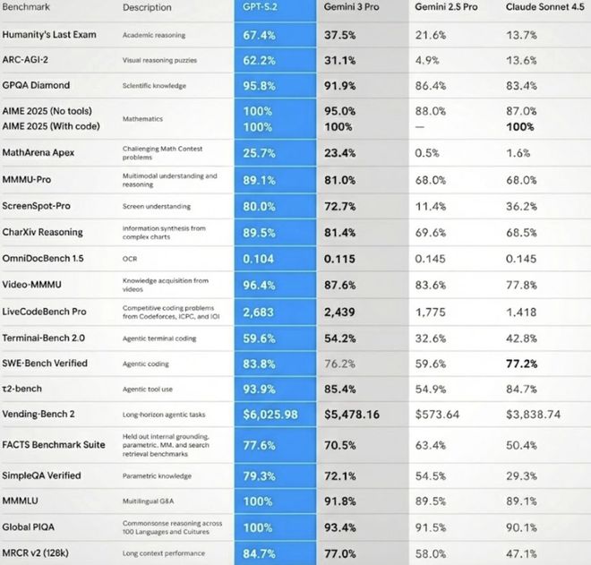 图片显示,GPT-5.2的基准测试分数几乎全面超越Gemini3Pro。