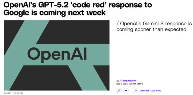 据TheVerge爆料,熟悉OpenAI计划的消息人士透露,OpenAI将在下周(12月9号)发布GPT-5.2,首次对Gemini3做出正面回应。