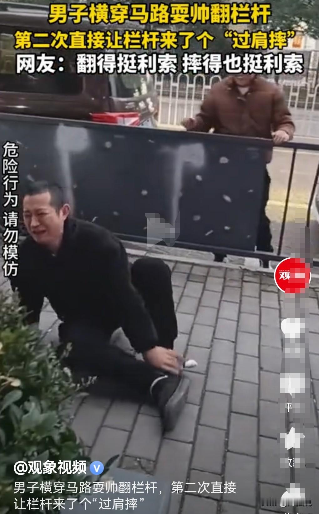 拍段子也是有风险的。 一男子想模仿东莞仔跨栏。 第1次跨的时候非常的潇洒啊。 结果第2次跨的时候直接摔倒在地上。 所以说少干这种危险的事情。 不是每一次都能够潇洒落地的。