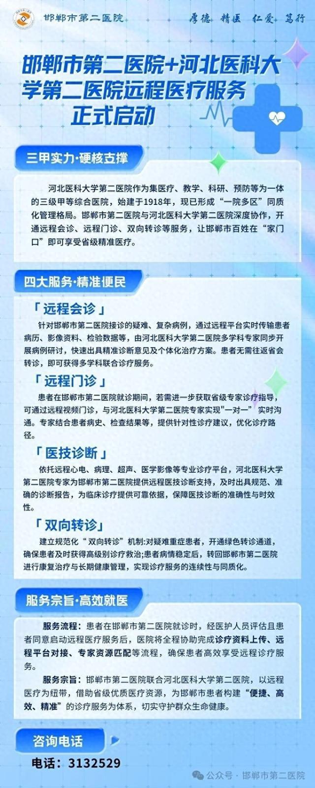 为进一步促进医疗优质资源流动,提升医院医疗服务质量,提高优质资源可及性,方便患者就医,邯郸市第二医院与河北科大学第二医院远程医疗服务正式启动。依托省级三甲优质医疗资源,通过远程会诊、远程门诊、医技诊断、双向转诊等远程医疗服务,让群众在家门口就能享受到省级优质医疗服务。