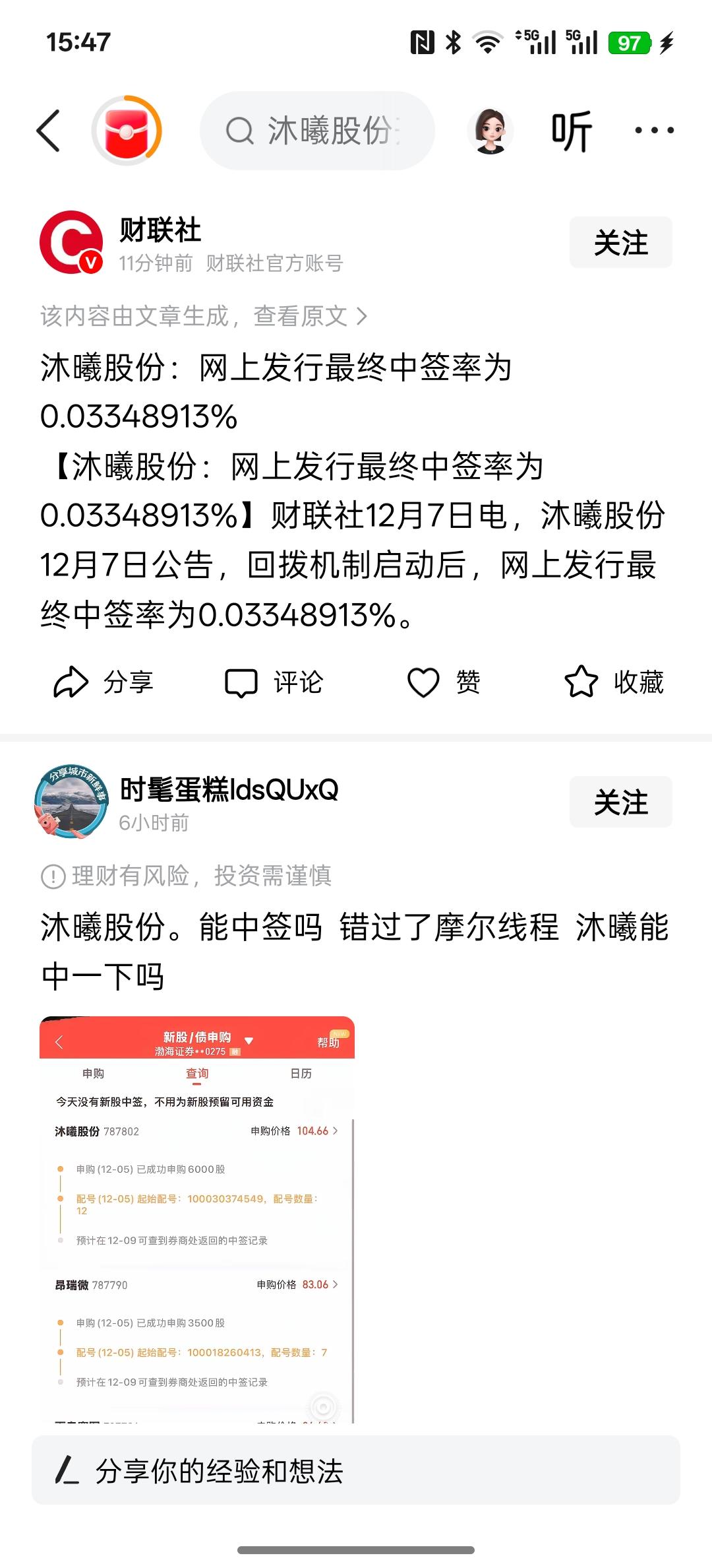 中签的又要吃大肉了,沐曦股份:网上发行最终中签率为0.03348913%,这家上市公司发行的股票,可是被机构抢筹,抢到爆满!大量的机构申购这家公司的股份,估计开盘会出现大涨的格局!申购的机构远比摩尔线程申购的机构还要多,现在国内的这些机构投资者还是比较看好中国在AI芯片发展的机遇!国家战略就是要发展国产芯片产业链,国产科技的创新,实现国产替代!他们的资本也持踊跃投资科技行业!所以估计这家上市公司开盘过后,股价应该能够涨到个700到600左右! 摩尔线程的申购有些散户直接就放弃了,中签都不要,最后股价涨到接近600,网络上统计中一签人均赚27万,也翻了好几倍!