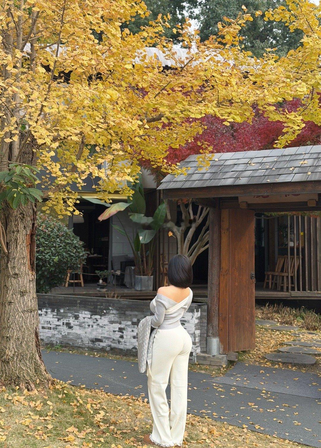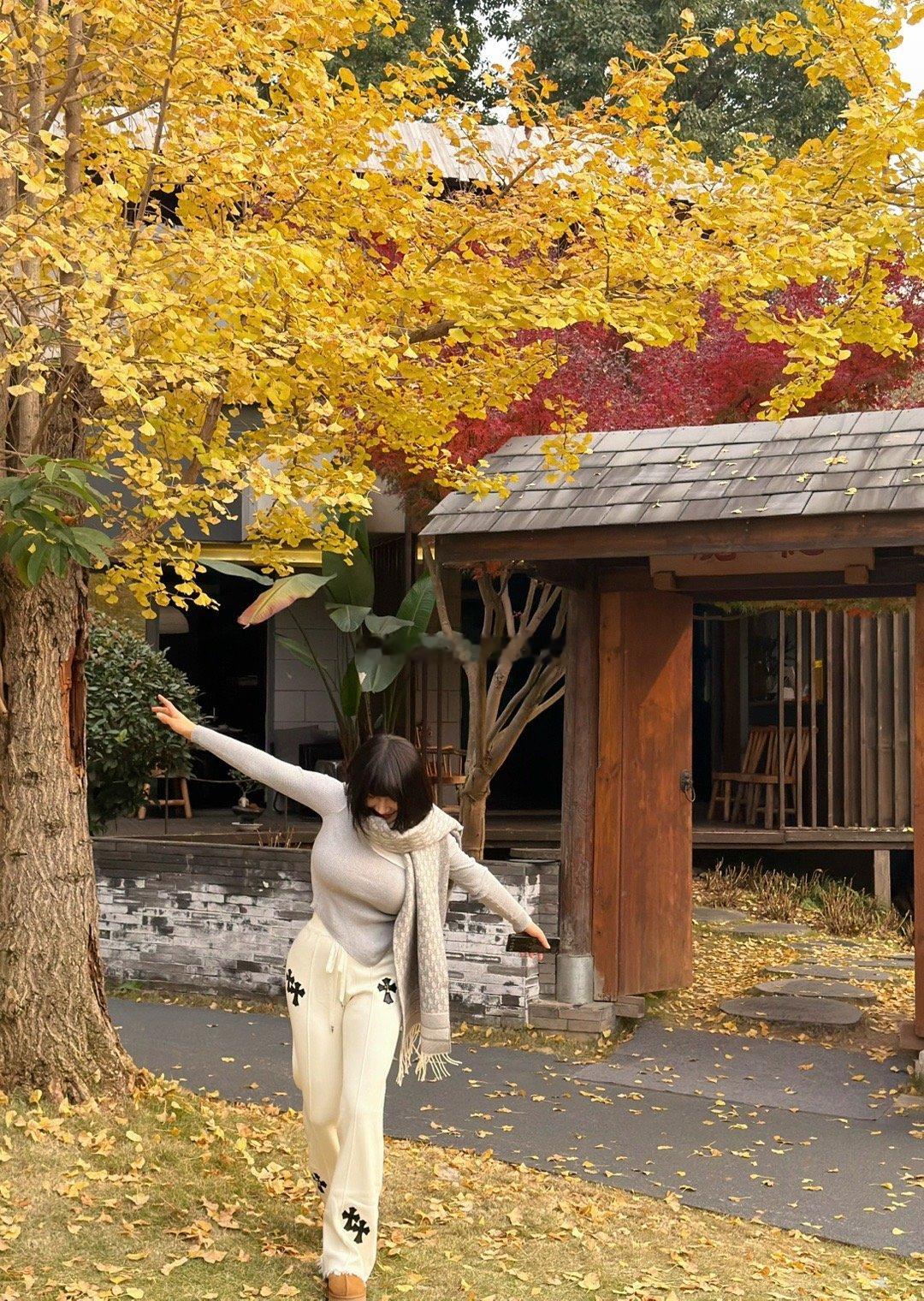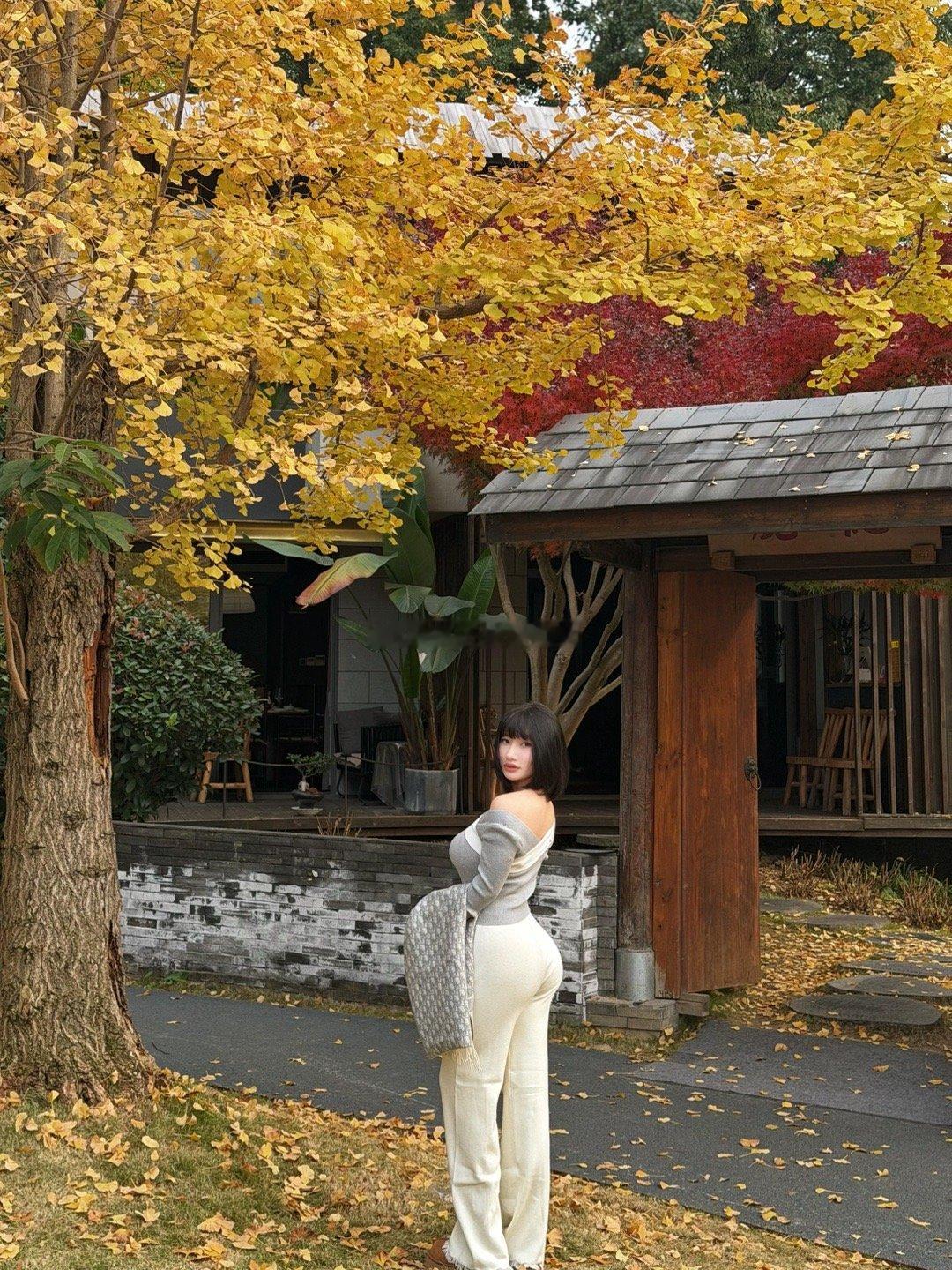 秋日暖阳下,美女漫步在金黄的林间小道,唯美浪漫。