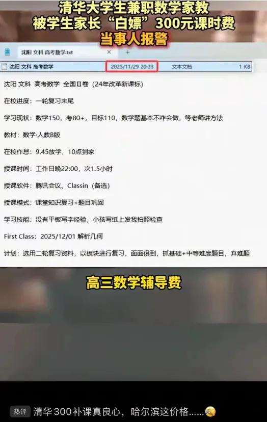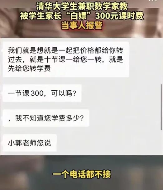 这年头,真有人连清华家教都敢“白嫖”? 沈阳一位高三家长,当初求着清华本硕学霸郭恩惠给孩子补数学,价格从150元砍到300元1.5小时(已是白菜价),孩子还打电话说太想跟您学。结果第一节课后,孩子第二节课蹭完免费答疑就玩消失,家长微信不回、电话不接。为300元,脸面都不要了。 学霸果断报警!虽然金额小没法立案,但警方介入后,家长立马怂了,火速打钱道歉。网友炸锅!这家长不是省了300块,是给孩子示范了如何赖账! 说到底,你盼孩子成才,却教他失信?补课补的是知识,但家教砸了,补再多课也难立人。清华学霸较真的不是钱,是那份不能被践踏的劳动尊严。这事儿您怎么看?评论区聊聊。
