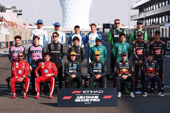 虎扑12月07日讯在F1阿布扎比收官战前,20位2025届F1车手在亚斯码头赛道拍摄了集体大合影。
