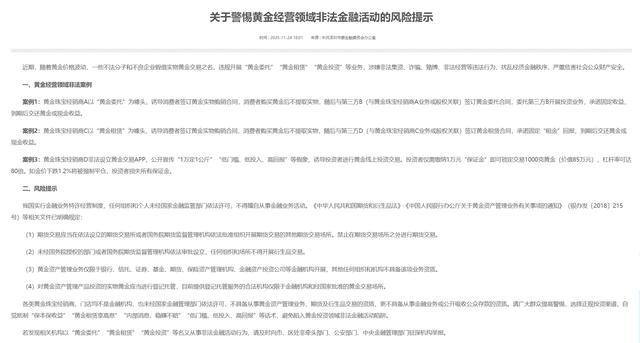11月24日,深圳市防范和打击非法金融活动专责小组办公室发布《关于警惕黄金经营领域非法金融活动的风险提示》指出,各类黄金珠宝经销商、门店均不是金融机构,也未经国家金融管理部门依法许可,不具备从事黄金资产管理业务、期货及衍生品交易的资质,更不具备从事金融业务或公开吸收公众存款的资质。请广大群众提高警惕,选择正规投资渠道,自觉抵制“保本保收益”“黄金租赁享高息”“内部消息、稳赚不赔”“低门槛、低投入、高回报”等话术,避免陷入黄金投资领域非法金融活动陷阱。