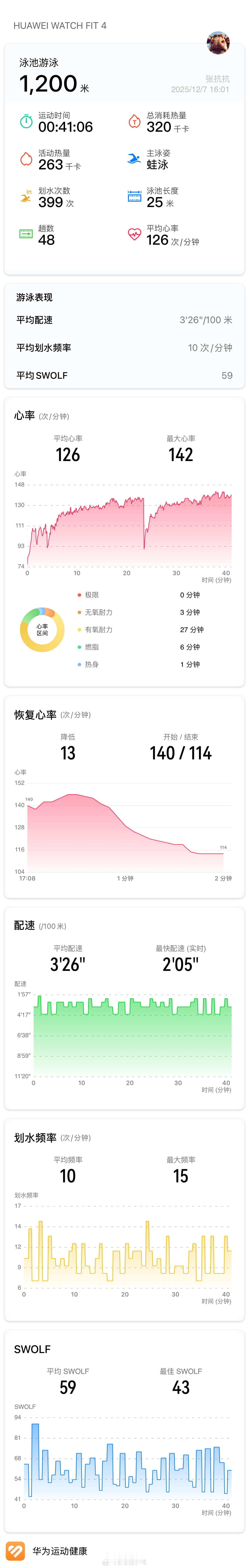 游泳1200米,明天应该可以继续游。 说我心率控制得不错。其实,游泳和跑步不一样,跑步过快,心率真的压不住,峰值每分200都有可能,非常危险。至于游泳,就像发动机来到了高原,由于进气不足,尽管深踩油门、主观上想多喷油,但转速上去得也慢,就会显得“转速很稳”。游泳打卡
