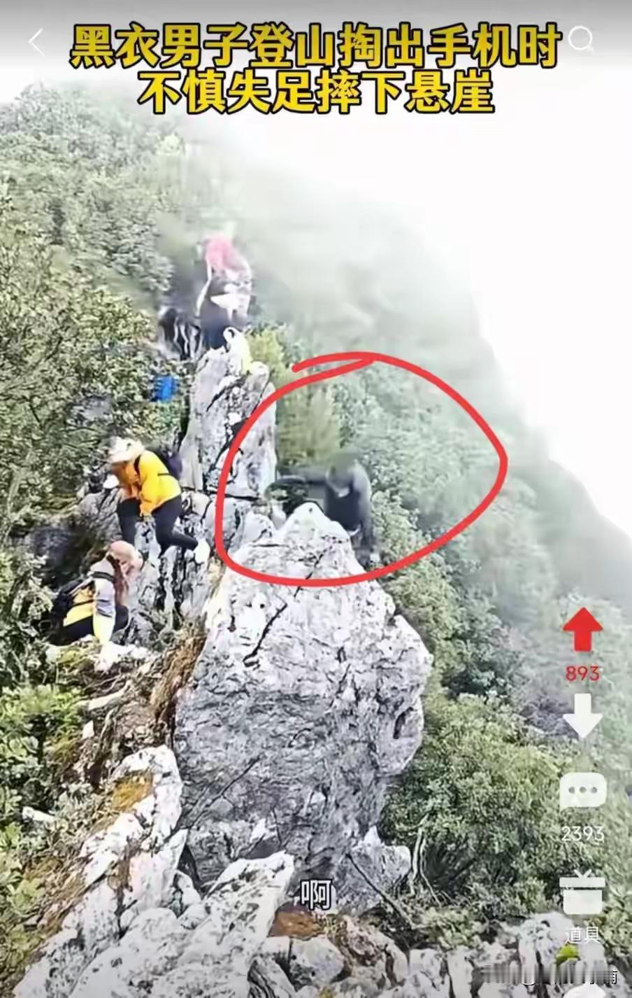 12月6号重庆一群驴友登山刚到山顶,人还没有站稳,黑衣男就掏出手机刷机,可是脚一滑男子啊的一声就从山崖坠落下去,山崖有千米深,大家都被吓到了,这个男人还是挺幸运的,滚下40多米被树挂住了,受了轻伤,如果是直接滚小去的话,不死也要重伤,登山过马路的不应该看手机,安全第一。