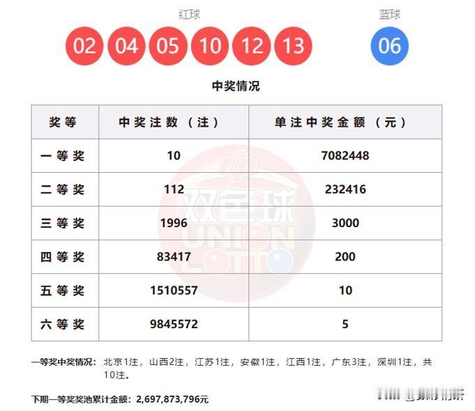 10注头奖,双色球第15141期开奖结果火热揭晓:02.04.05.10.12.24+06。全国共中出10注一等奖,单注奖金高达708万余元!大奖花落全国七地,分别是北京1注、山西2注、江苏1注、安徽1注、江西1注、广东3注、深圳1注。恭喜各位幸运得主,今夜收获颇丰! 值得一提的是,有网友此前晒出一张“9+16“大复式票,最终中得5+1,总奖金34950元,颇为可惜-仅因红球一号之差(未中出02),与1注一等奖及15注二等奖擦肩而过。不过,税后回报仍超本金十倍之多,已属难得。正所谓知足常乐,心态决定境遇,或许大奖正悄然在不经意间与你相遇。