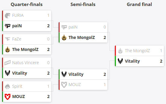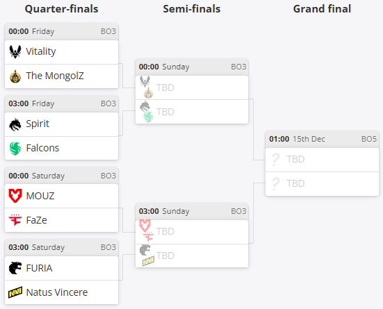 虎扑12月08日讯随着StarLadder布达佩斯Major第三阶段瑞士轮小组赛于刚刚全部结束,布达佩斯Major八强席位正式尘埃落定,他们分别是:Spirit、FURIA、Vitality、MOUZ、TheMongolZ、NAVI、FaZe、Falcons。