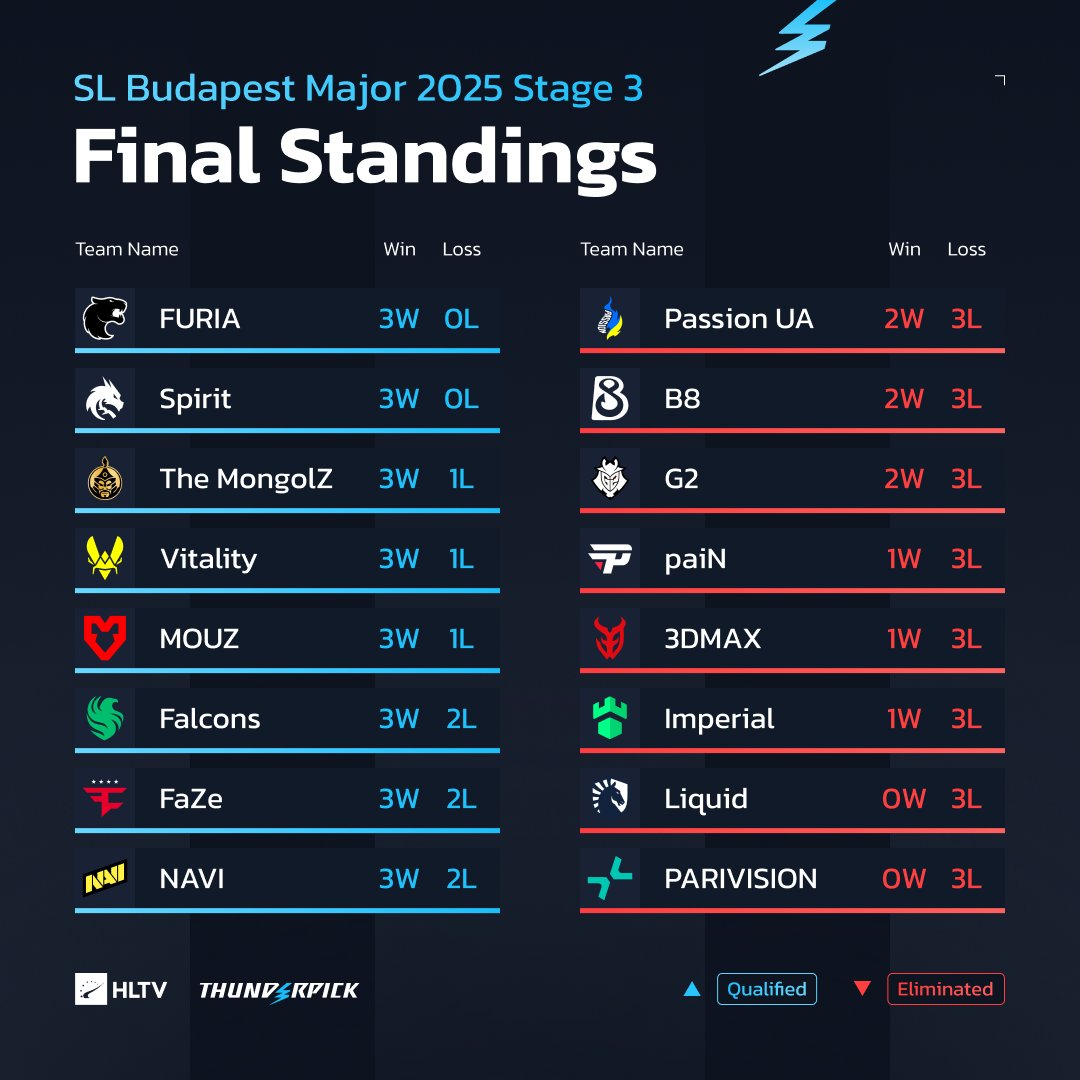 本届赛事第三阶段共有八支战队成功晋级下一阶段。它们分别是:FURIA和Spirit成绩为3胜0负,TheMongolZ、Vitality、MOUZ为3胜1负,Falcons、FaZe以及NAVI成绩为3胜2负。