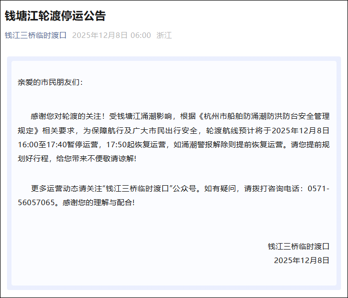 12月8日,“钱江三桥临时渡口”发布通知,受钱塘江涌潮影响,根据《杭州市船舶防涌潮防洪防台安全管理规定》相关要求,为保障航行及广大市民出行安全,轮渡航线预计将于2025年12月8日16:00至17:40暂停运营,17:50起恢复运营,如涌潮警报解除则提前恢复运营。请您提前规划好行程,给您带来不便敬请谅解!