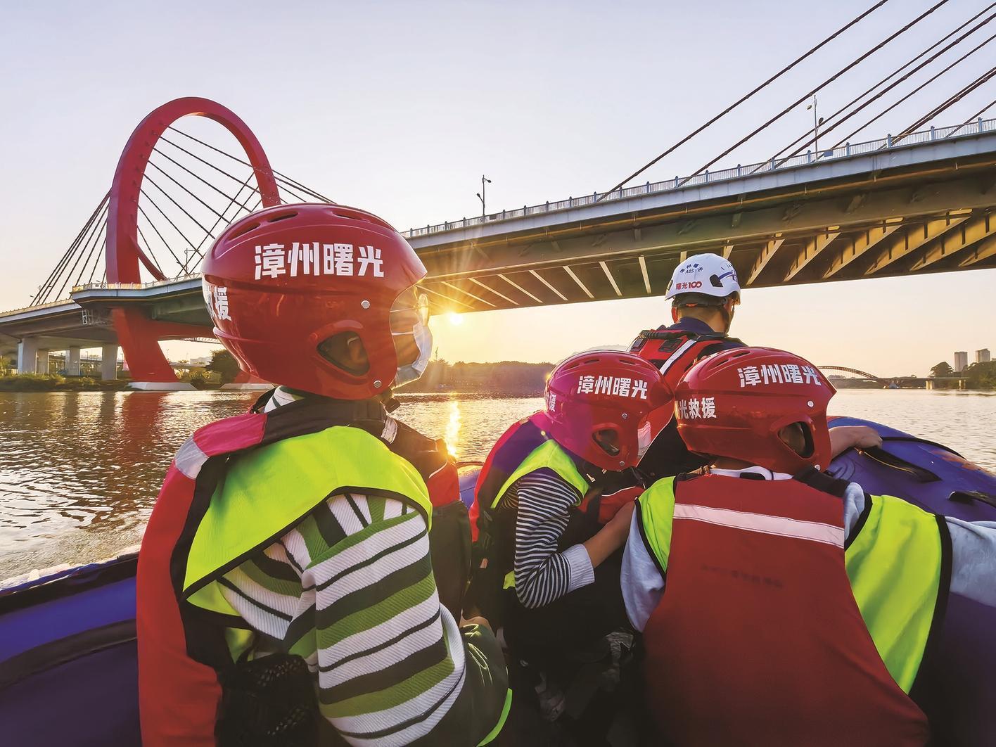 本期活动中,20名来自华安县的困境儿童奔赴芗城区、漳州高新区开启研学之旅。在市城市展示馆、科技馆,他们通过参观和互动体验,直观领略城市发展的日新月异与科技的奇妙无穷,并在布袋木偶表演中,感受闽南文化的独特韵味。在市青少年宫,以“接纳小黑点”为主题的心理辅导,教会孩子们将心中的“小黑点”变成治愈画,拥抱不完美的自己。走进市曙光救援队水域训练中心,他们系统学习了心肺复苏、海姆立克急救法等自救互救技能,亲身体验救援舟艇(下图),深刻体会救援人员的责任与担当。其间,孩子们还在龙江岁月学习了螺钿非遗手工、朋克木雕手工制作。