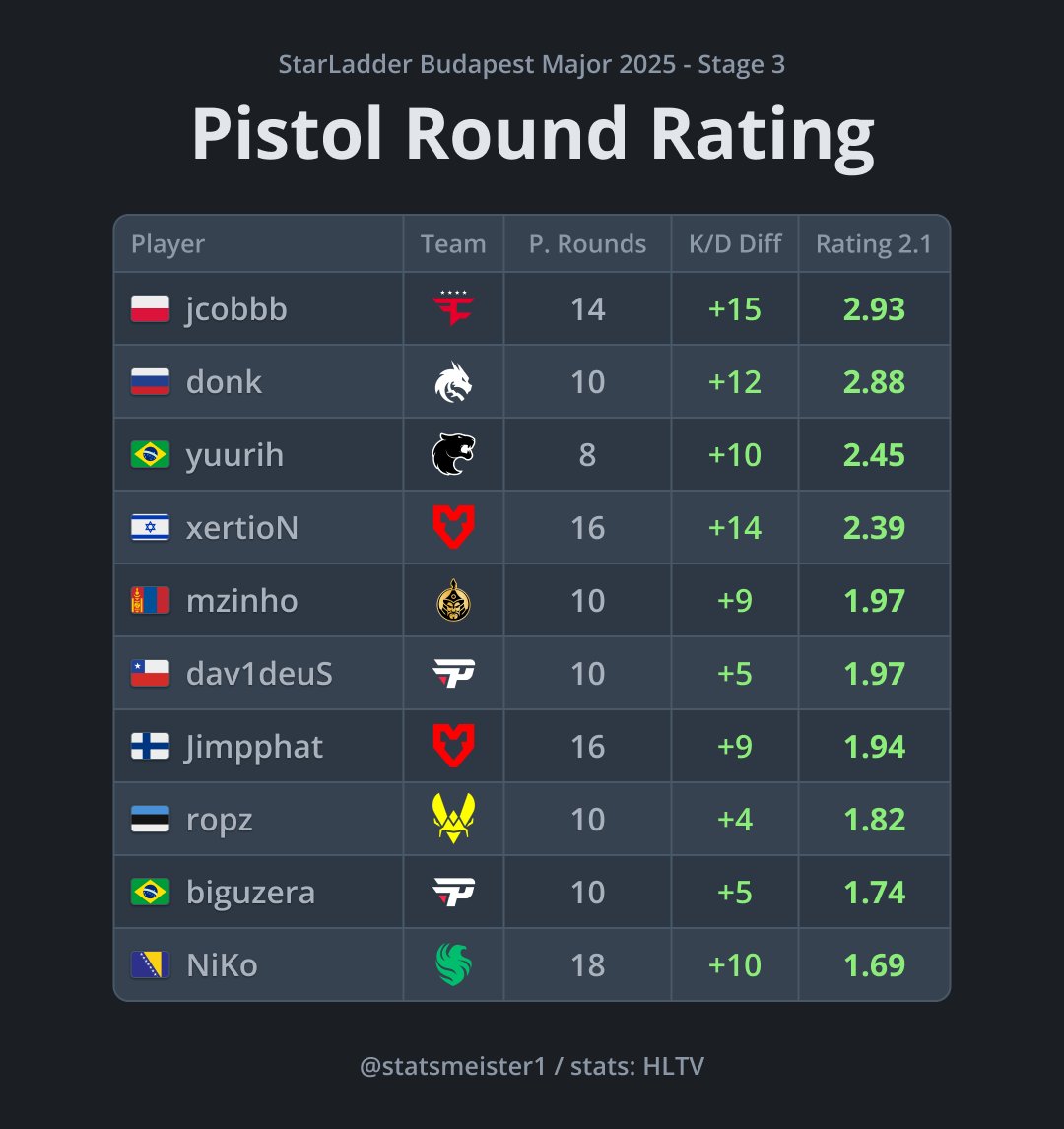 虎扑12月08日讯CS数据统计媒体报道,2025年布达佩斯Major第三阶段手枪局最佳选手数据榜单公布