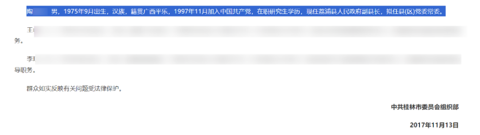 大皖新闻记者查询发现,桂林市委组织部2021年7月7日发布的《领导干部任职前公示》显示,陶某某的出生年月是1975年9月,当时他是“现任荔浦市委常委、纪委书记、监委主任,拟任县(市、区)党委副书记;”此外,在桂林市委组织部2017年11月13日发布的《领导干部任职前公示》信息中,陶某某的出生年月也是1975年9月,当时他是“现任荔浦县人民政府副县长,拟任县(区)党委常委。”