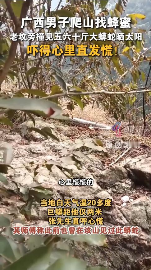 “太吓人了!”12月5日,广西城防港,一男子上山找蜂蜜时,途经一座老坟,他刚要离开,却发现不远处有条蟒蛇在晒太阳,看起来至少有60斤!由于距离太近,吓得男子大气都不敢喘,急忙逃走了。网友:还没冬眠吗? 随着气温越来越低,北方地区已经很少能见到蛇类了,但是南方部分地区的温度依旧属于蛇类的舒适区,它们还会正常的活动,所以大家在户外活动时,还是要多留意周围的环境。 当天上午,张先生前往山中找蜂蜜,他一路奔走,翻越了小河和山丘,就在他穿过一处坟地时,却突然看到前方有什么白白的东西。 在好奇心的驱使下,张先生又往前凑了凑,可这不看不要紧,一看差点让他没站稳,因为那是一条数米长的巨蟒!幸好正在休息,没有发现张先生。 张先生来不及多想,立刻拔腿就跑,这要是被缠上了,那他一个人可能就要交代在山上了! 据张先生所说,他当天爬的那座山上,有很多深不见底的石洞,不知道山上究竟藏了多少“大货”。 网友看后表示,这么粗的蟒蛇,可能不止60斤,就这体格,估计连羊都能吞得下去,附近的村民可一定要小心了! 信息来源:《男子在山上偶遇大蟒蛇晒太阳,目测有60斤,拍完赶紧走了。》新界视频