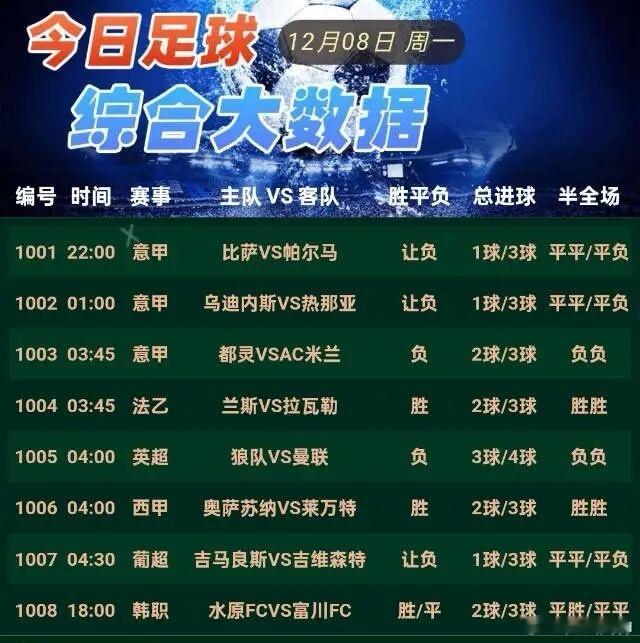 12月8日001比萨vs 帕尔马002 乌迪内斯 vs 热那亚003 都灵vs AC 米兰 008 水原 FC vs 富川1995