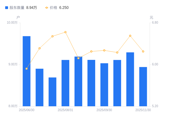 日期A股户数(户)流通A股户均持股数(股)户均持股市值(万元)2025-11-308939419729.7712.332025-11-109291318982.5212.432025-10-209108519363.4812.062025-09-309029519532.9012.252025-09-209110419304.9012.072025-09-109189219139.3511.712025-08-319107919310.1912.782025-08-208689320240.4513.242025-08-108899419762.6012.472025-06-309677618173.4410.76