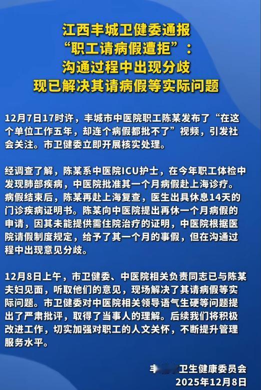 护士患癌请假遭拒绝后续:卫健委通报,双方已协商解决…… 12月8日,闹得沸沸扬扬的“护士因肺癌向医院请病假遭拒”事件,引来了江西丰城市卫健委通报。 据通报中解释了事件原委,原来当事女护士请了两次假: 第一次请假:女护士在员工体检时,发现肺癌,于是医院就给与了一个月的病假,让她去上海治疗。 第二次请假:女护士去上海复查,医生开了一张14天休假证明。 于是女护士拿着上海医院的医生开的证明去找领导休假,女护士申请了一个月,经过沟通,最终女护士所在单位给了一个月假。 冲突:是在沟通过程中,存在了意见分歧。 基于此,女护士就将自己的遭遇发布到网络上,引发了网友热议。 随着舆论发酵,女护士所在的单位丰城市中医院,跑去找当事女护士夫妇沟通,双方经过沟通,已经解决了请病假的问题。 同时,卫健委对女护士所在的医院提出了批评。 值得一提的是,女护士家人在12月8日发了一条视频,更新了进展,并表达了自己的诉求。 其一,医院的领导凌晨12点多一行人,跑到女护士家门口,希望双方坐下来协商解决,并让下架视频。 其二,女护士丈夫表示,自己发出视频的理由,觉得医院对待基层员工,重疾病病假不给请,不合理。 看整个事件,反映了基层员工在很多基本权益方面,存在的不公平以及有失合理性。 患癌女护士请病假遭到拒绝,女护士所在的医院,确实存在一些问题,如女护士请假时长,还有半夜找她及家人解决及下架视频的做法。 目前,卫健委介入,医院方面也表明了自己的态度,表面看涉事医院接下来会细化基层员工的一些福利。 但从长远来看,女护士接下来在医院的日子,应该也不会太“安逸”,对此,您怎么看?