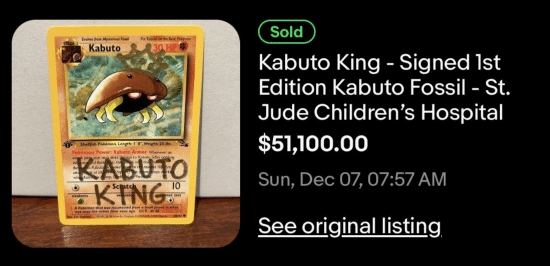 12月4日至7日期间,KabutoKing举办了一场线上拍卖会,拍卖品是一张由他亲笔签名的化石系列初版“化石盔”卡牌。最终,这张卡牌在eBay上以51100美元的价格成交!这个价格远超卡片本身的价格。要知道,在拍卖开始前,品相接近全新的同款卡牌在TCGPlayer上的售价约为1美元。