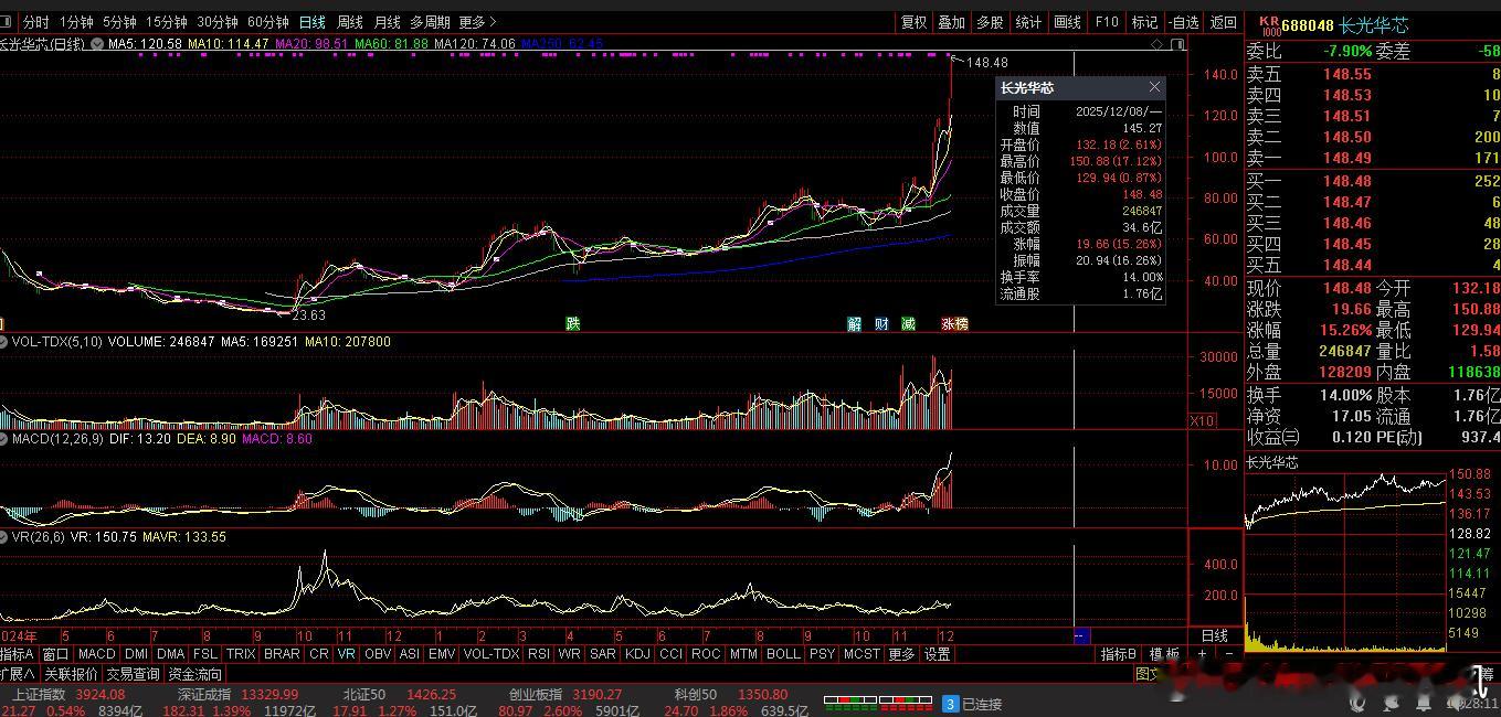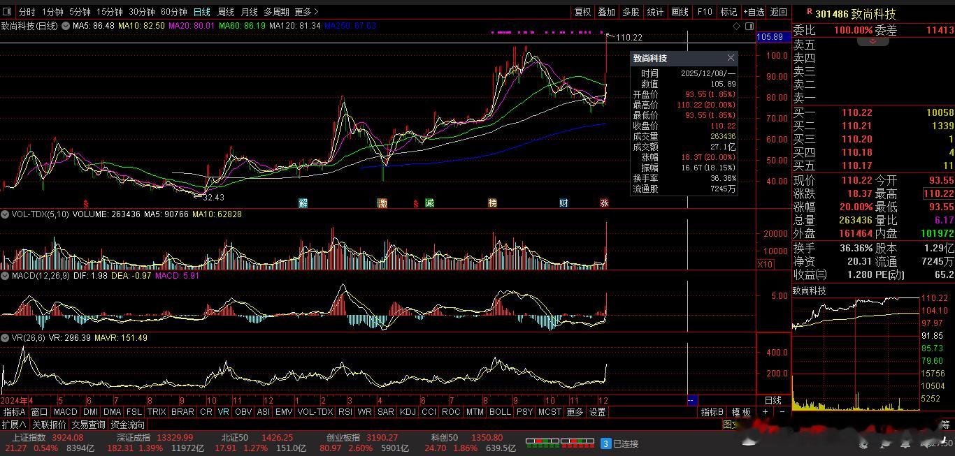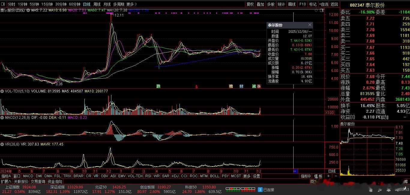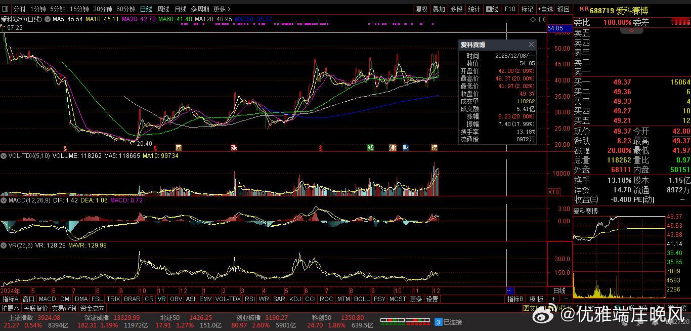 【财富晚茶】午盘透析(12.08):北证涨幅1.27%:林业反弹油服回调导语:作者系《网易号》优质财经领域创作者。曾经原创作者和知名网易号旅游领域创作者。大跨度行业等的写作,颇受网友喜爱。作品发表于2025.12.08.12:18 优雅端庄晚风。(标题作品:美国通加斯国家森林:阿拉斯加原始温带雨林)【内容概述】今日股市午评:截止11:30:沪指:贡献1根阳线0阴线。深指:贡献1根阳线0阴线。沪指突破:阻力位:03907点。沪指突破:支撑位:03863点。深指突破:阻力位:13164点。深指突破:支撑位:12938点。追寻盘面:沪深强势收复失地,尾盘三跌主力低吸。一、透析市场:风口公司,上下起伏002347 泰尔股份 盘中 03涨1、突破八年箱顶视野盘面:前期双顶,调整反弹:2025-12-08 截至11:30:股价报收:7.68元。股指上涨:2.67%。成交总量:813595手,成交金额:6.27亿元。总换手率16.49%,观总市值:37.89亿元。流通市值:37.89亿元。2、高端装备龙头主营业务:高端装备-智慧运维服务的研产和销售。公司品牌:国内领先高端装备和方案服务商。3、营收优净利减业绩好转:2025-09-30 三季度报:公司营收:8.231亿 同比增11.57%。公司净利:-5369.0018万 同比增-240.29%。二、沪深红盘:多方强势,喜剧股市今天目击:沪深北市:早盘:高开二涨,二跌四涨。尾盘:一涨一跌,次高红盘。看点之一:沪深北指:股指高开:盘中强势:瞬间拉升。看点之二:强势黑马:创指超强:大涨逾3%。看点之三:沪深北市:半日成交:12992亿元。盘面追踪:3409股飘红。三、沪深阳棒:个股强势,赚钱效应沪深追踪:截至午间:市场收盘:沪指涨0.62%报3927.19点,深指涨1.55%,创指涨3.02%,北证50指涨1.42%,沪深北市:12992亿元。四、盘面观察:林业脉冲,油服回调1、板块扫描透析沪深板块:板块走强:林业、券商、半导体、军工、保险等。板块回调:油服、焦炭加工、煤炭开采等。概念活跃:CPO概念、量子科技、存储芯片、商业航天等。2、个股涨跌起伏沪深北市:多空遭遇。3409上涨,104个股涨停板。1866股下跌,2跌停板。沪深北市:合计成交:12992亿元。午盘视野:沪深反弹收复失地,尾盘杀跌主力抢筹。五、沪深涨跌:三甲前茅,安不忘危1、今日涨幅谁家主旋律:天经地义:风口股票涨停板688719 爱科赛博 301486 致尚科技 688048 长光华芯第一、涨幅榜眼排行榜-1:688719 爱科赛博主营业务:电力电子变换-控制设备的研产和销售。公司品牌:国内一国际知名先进电力电子设备供应商。排行榜-2:301486 致尚科技主营业务:精密电子零部件-消费通讯电子汽车电子等研产和销售。公司品牌:国际电子零部件生产商和技术服务商。排行榜-3:688048 长光华芯主营业务:半导体激光芯片研产和销售。公司品牌:全球少数高功率激光芯片量产能力头部企业。第二、综评榜技术看盘-1:301486 致尚科技。潜力股票-1:301486 致尚科技:国际电子零部件生产商和技术服务商。风险股票-1:暂时没有:即无301092 争光股份。2、今日跌幅谁家主旋律:摇摇欲坠:弱势股票涨停板001336 楚环科技 603815 交建股份 688331 荣昌生物跌幅榜-1:600082 海泰发展主营业务:高新技术企业孵化器的研产和销售。公司品牌:国内最早一家“以创业孵化带动工业地产与产业投资”的工业园区和头部企业。跌幅榜-2:603815 交建股份主营业务:公路市政基础设施-工程检测等的研产和销售。公司品牌:基础设施建设一流企业。跌幅榜-3:688331 荣昌生物主营业务:创新特色同类首创生物药等研产和销售。公司品牌:中国领先全球一流的生物制药公司。六、创作不易:优质网易,财经作者投资投机迷茫之中:给予尽可能有帮助:资本市场风险自负。(优雅端庄晚风《网易号》财经领域创作者和原创作者 违者必究)