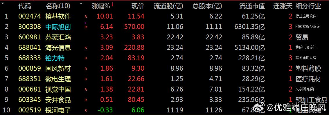 【财富晚茶】十大利好(12.08):追寻沪深北市十大利好信息的股票导语:作者系《网易号》优质财经领域创作者。曾经原创作者和知名网易号旅游领域创作者。大跨度行业等的写作,颇受网友喜爱。作品发表于 2025.12.08.15:18 优雅端庄晚风。编者的话:追寻市场:蛛丝马迹动态趋势。今天主题:【财富晚茶】十大利好(12.08):追寻沪深北市十大利好信息的股票。最新市场:新鲜出炉:2025.12.08.15:18十大利好股票参考。偏重其中:机构分析、龙虎榜数据、高成长性潜力等。综合筛选:涵盖应用软件、网络、集成电路等领域。兼顾短期:热点长期估值。每个股票:附简要利好原因。一、主力资金:市场表现前三佳股票榕基软件(002474)中际旭创(300308)苏豪汇鸿(600981)二、主力资金:十大利好信息的股票1、榕基软件(002474)核心逻辑:海峡西岸软件行业龙头。晚间点评:电子政务、质检三电工程、协同管理、信息安全等软件提供商。华为优选级ISV伙伴,与华为在多领域有合作。2、视觉中国(000681)核心逻辑:全球领先视觉内容数字版权交易平台和头部服务供应商。晚间点评:拥有国内最大的视觉内容互联网版权交易平台,Sora概念(文生视频)+快手概念+AI语料。3、苏豪汇鸿(600981)核心逻辑:江苏最早从事进出口贸易省级头部公司。晚间点评:供应链运营实力强劲。晚间点评:纺织服装出口全国第五,纸浆销售稳居全国前三,绿色循环业务占比超24%,海外业务遍及160多国,2025年业绩扭亏大增。4、银河电子(002519)核心逻辑:数字电视多媒体终端等产品行业领先。晚间点评:军工智能机电与数字电视终端业务并重,业务涵盖军工智能机电、电动汽车零部件、数字电视智能终端,军民融合与商业航天概念兼具。5、中际旭创(300308)核心逻辑:全球高速光模块龙头。晚间点评:800G产品市占率全球第一,硅光技术良率达95%,绑定谷歌、Meta等头部客户。6、海光信息核心逻辑:国产CPU/DCU领军者。晚间点评:党政、金融信创市场市占率超30%。7、国风新材(000859)核心逻辑:战略性新材料科技型头部企业,合肥国资委旗下平台。晚间点评:二十余年专注于薄膜材料生产,光刻胶+芯片概念+雄安新区。8、安井食品(603345)核心逻辑:国内知名度速冻食品龙头。晚间点评:新品沉淀蓄势,经营状态趋稳,消费复苏背景下具备潜力。9、微电生理(688351)核心逻辑:全球竞争力精准介入导航诊断消融治疗一体化解决方案和头部企业。晚间点评:自研PFA产品获批,电生理产品矩阵持续丰富,创新药高质量发展大会催化行业机会。10、铂力特(688333)核心逻辑:全球领先金属增材制造技术全套解决方案头部提供商。晚间点评:金属3D打印龙头:为火箭和卫星制造复杂零件,效率高且省材料。风险提示1、部分科技板块亦或估值偏高需留意外部环境。2、美联储政策中美贸易摩擦内部经济不确定性。三、主力资金:其他利好信息的股票1、车载导航数据安全路畅科技(002813)核心逻辑:车载导航研发领先企业。晚间点评:数据安全,中联重科旗下,主营智能座舱、智能辅助驾驶及智能网联相关产品。2、高速公路高现金流福建高速(600033)核心逻辑:运营泉厦、福泉等优质路段。早晨点评:资产负债率仅18%,现金流充沛,当前PE 8.75倍低于行业龙头,具备防御属性。四、 创作不易:优质网易财经作者投资投机迷茫之中:给予尽可能有帮助:资本市场风险自负。(优雅端庄晚风《网易号》财经领域创作者和原创作者 违者必究)