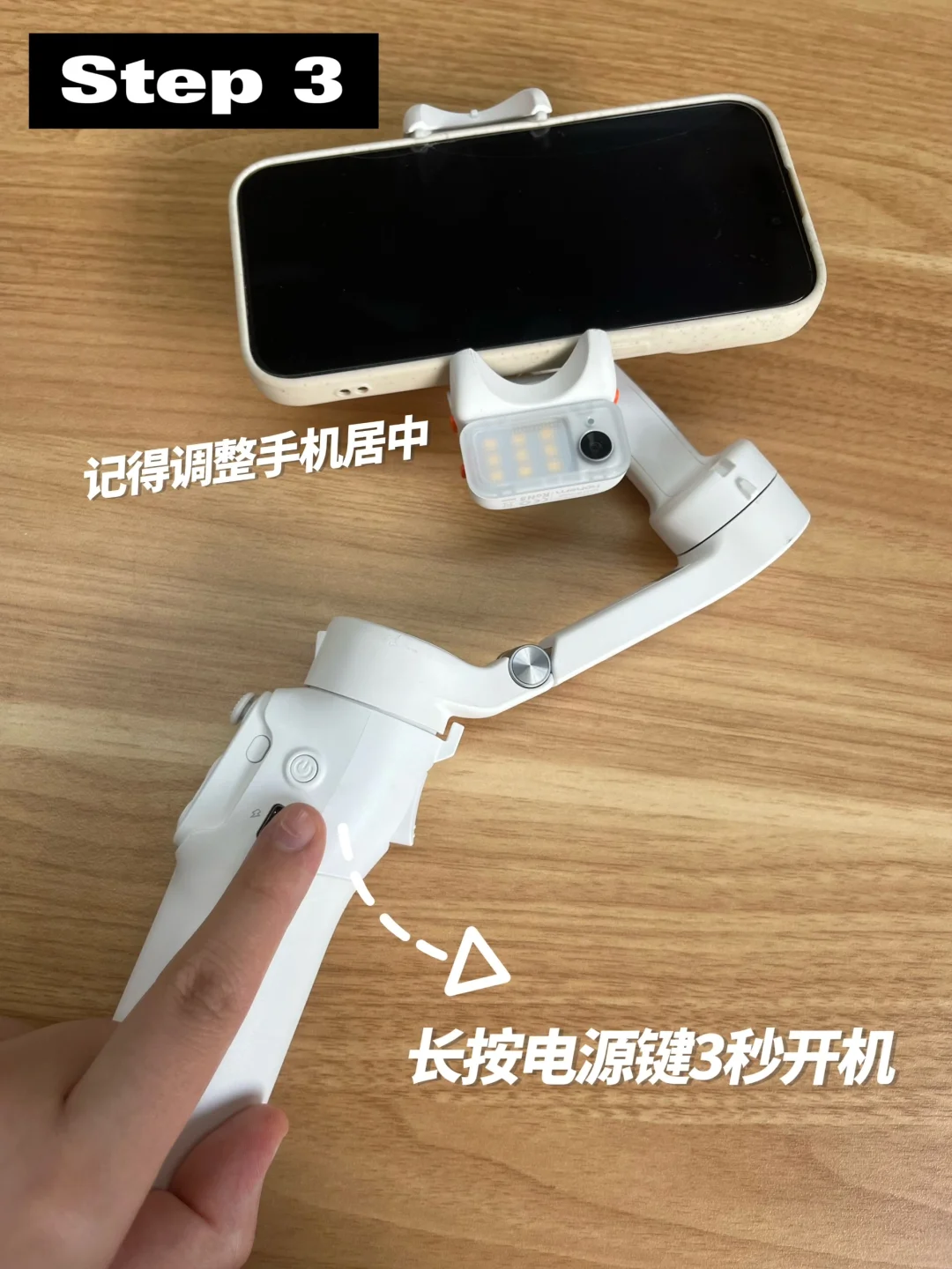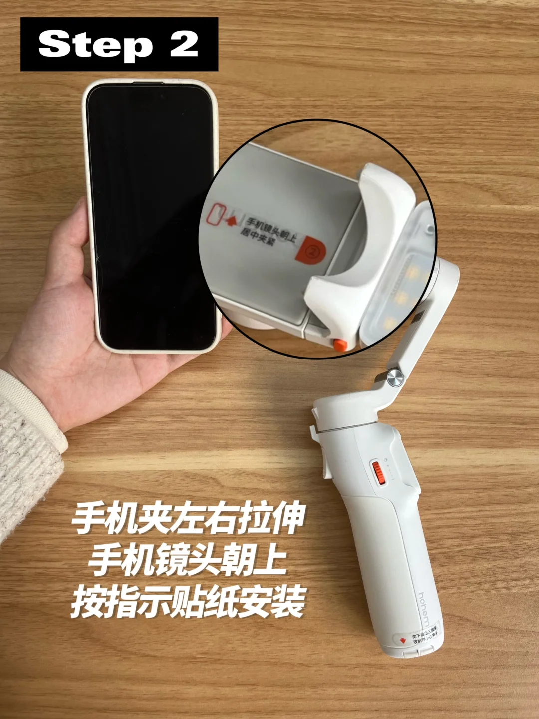 首先是夹手机:将手机镜头朝上,轻轻放入手机夹中,然后调整手机的位置,让它紧贴夹子的硅胶垫,并且要确保手机的尺寸在稳定器的兼容范围内哦,一般 7 英寸以下,重量不超过 300g,宽度在 58mm-98mm,厚度不超过 12.5mm 的手机都可以使用。夹好手机后,我们可以检查一下是否夹紧,避免拍摄过程中手机晃动。