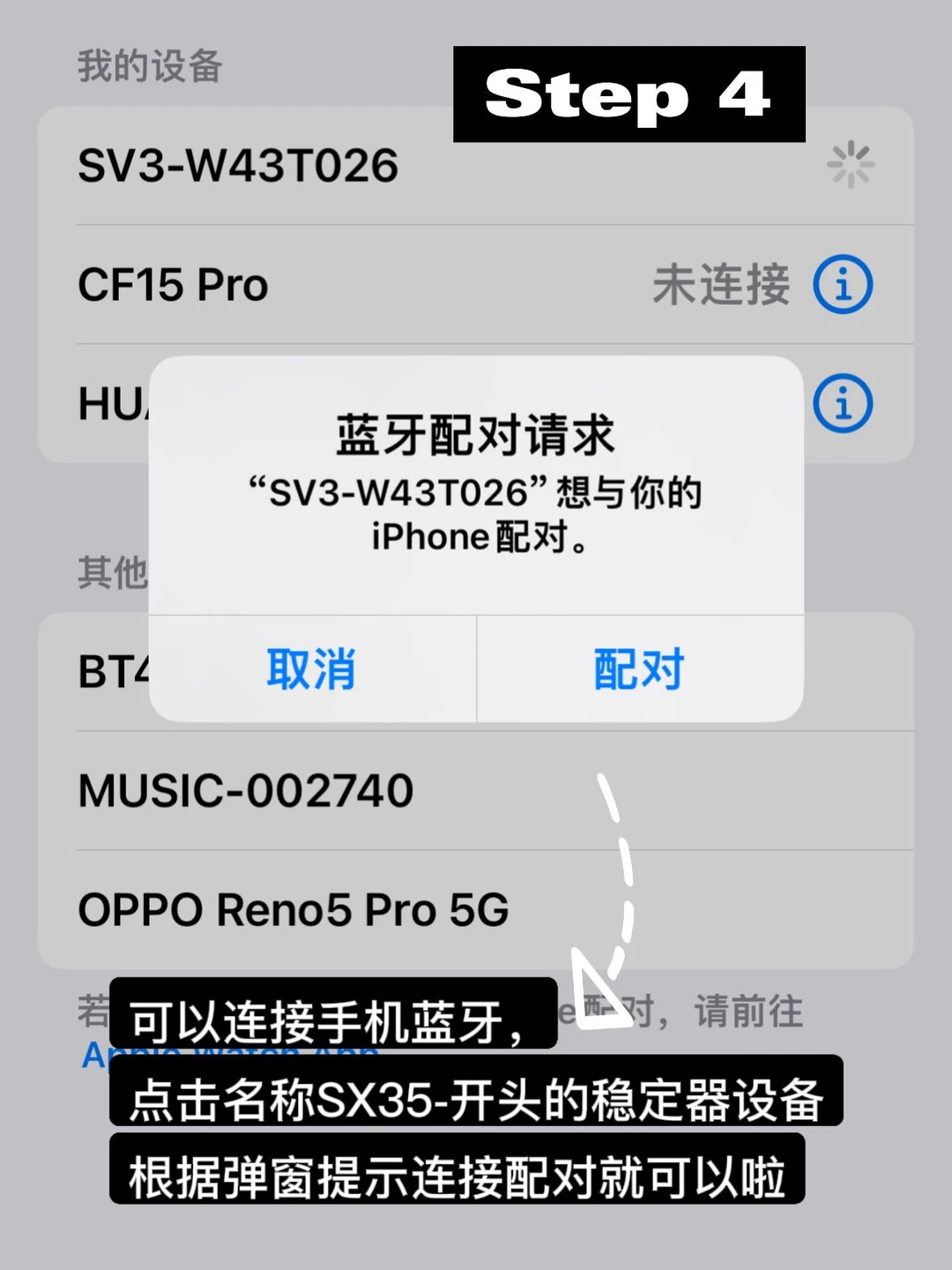 开机后,我们可以连接手机蓝牙,搜索并点击名称为 SX35-XXXXXX 的稳定器设备,根据弹窗提示连接配对就可以啦,连接成功后蓝牙灯会蓝灯常亮。