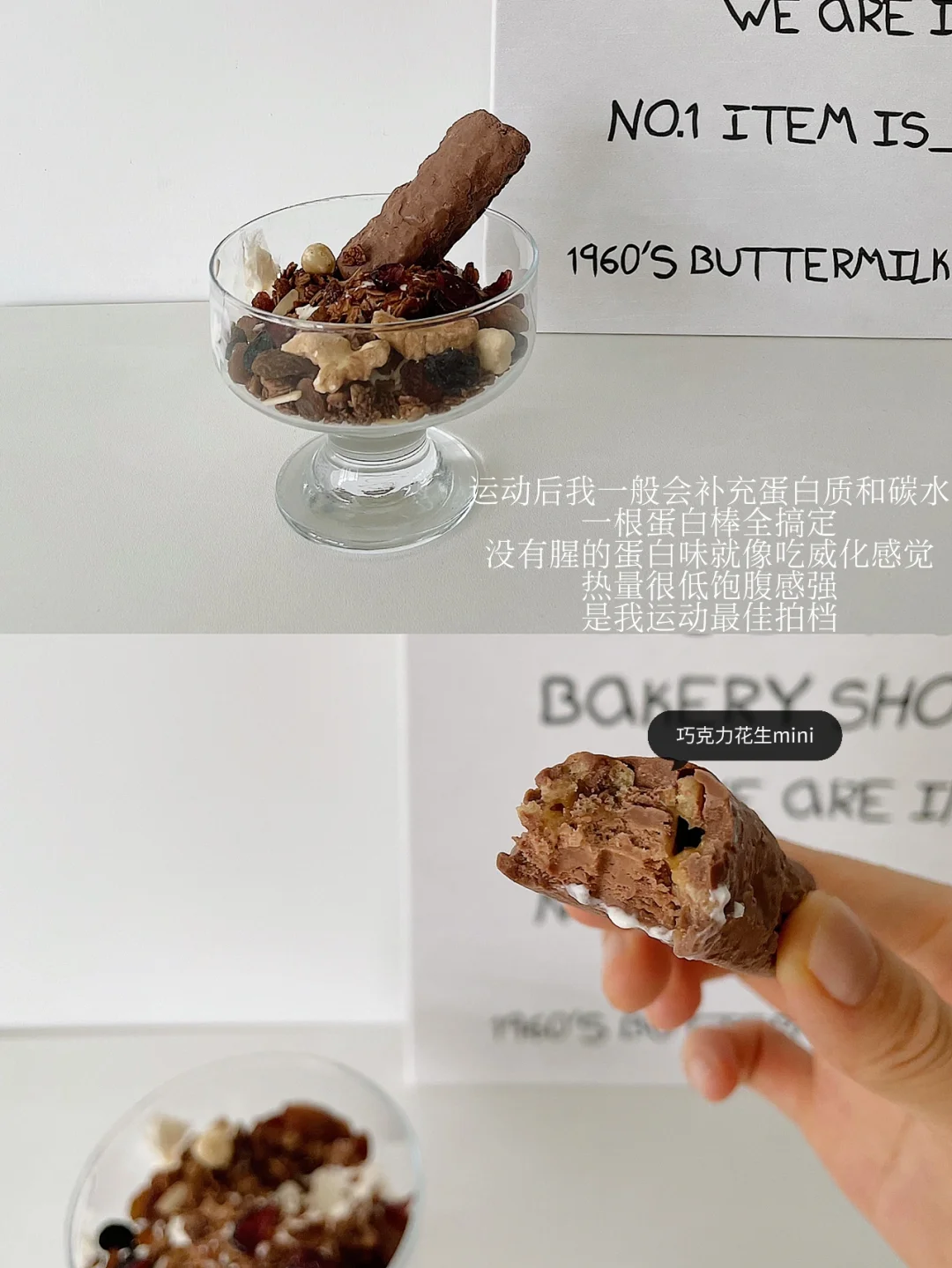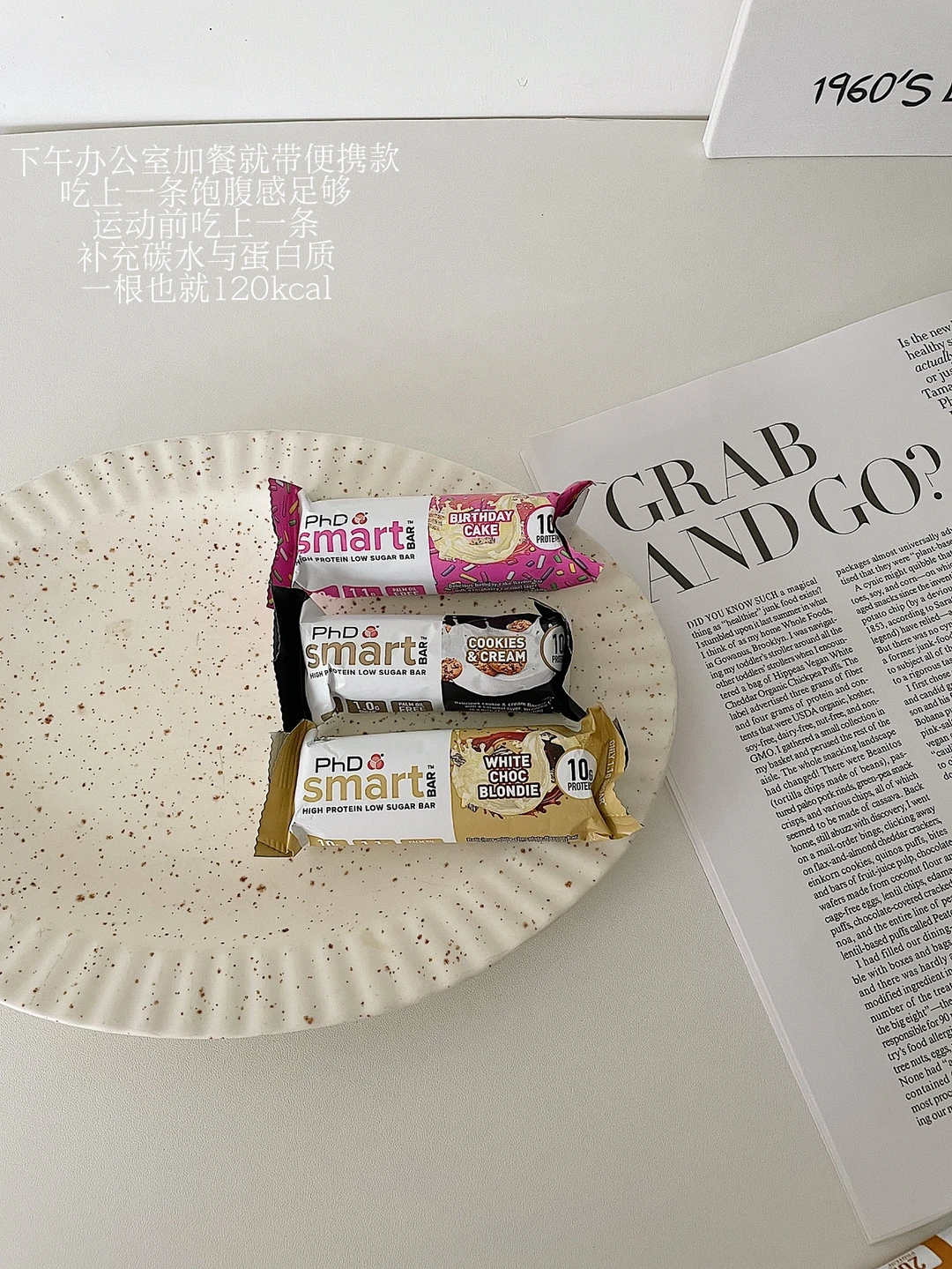 浓稠酸奶搭配蛋白棒、麦片等,满足运动后要补充碳水、蛋白质的我。我非常喜欢没有任何蛋白质腥味的蛋白棒,而且口感丰富,也会不粘牙。吃上一条就很饱腹,适合爱运动或者减脂期馋甜食的伙伴。