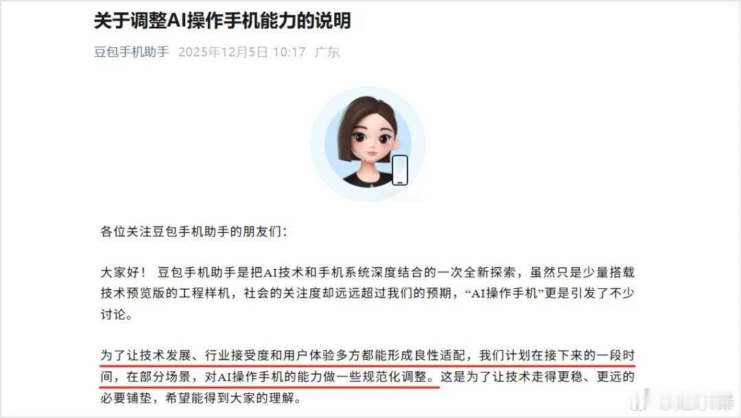 豆包手机遭围剿:微信淘宝集体封杀,大厂在怕什么?字节跳动推出的豆包手机助手(搭载中兴/努比亚工程机),因让AI深度操控手机,刚亮相即遭全网“围剿”——微信拒登、淘宝弹窗、金融与游戏类APP纷纷拦截。12月5日,豆包被迫公告妥协:暂停操作金融、游戏类APP,寻求与厂商共建。这一退,意味深长。这让人想起日本动画《爷爷的煤油灯》:当电灯来临,守着煤油灯的人执拗点火,却打不着火,最终崩溃。旧时代终将被照亮,也终将被取代。大厂们怕的,正是这道“强光”。豆包助手本质是AI智能体(Agent)——不再只是“陪聊”,而是“办事”。你只需说:“按微信里的地址打车”,它便自动读消息、提取地址、唤起打车软件下单。AI从“动嘴”变为“动手”,直接穿透APP壁垒。而这,正是巨头们的软肋。1️⃣ 入口危机:微信、淘宝等是“超级APP”,靠流量分发变现。用户必须打开APP,看广告、刷信息流。而豆包一句指令直达服务,绕开整个流量链条,等于动摇其商业根基。2️⃣ 控制权失守:AI拥有系统级权限,能操作屏幕、跨APP联动,相当于在手机里安了个“总调度”。这对依赖封闭生态的平台而言,无异于“主权沦陷”。3️⃣ 数据护城河被侵蚀:用户行为不再沉淀于单一APP,而是被AI整合调度。谁掌握AI,谁就掌握用户行为全景——这正是大厂最不愿交出的权力。于是,一场以“安全风控”为名的联合抵制,实则是流量霸权的保卫战。可悲的是,创新者被围剿,不是因为技术不成熟,而是因为它太“成熟”——成熟到足以颠覆旧秩序。历史总在重复:当年的智能手机颠覆功能机,如今的AI助手,正试图颠覆APP帝国。大厂们握着打火石,站在新时代的门口。可这一次,火光再亮,也挡不住黎明。