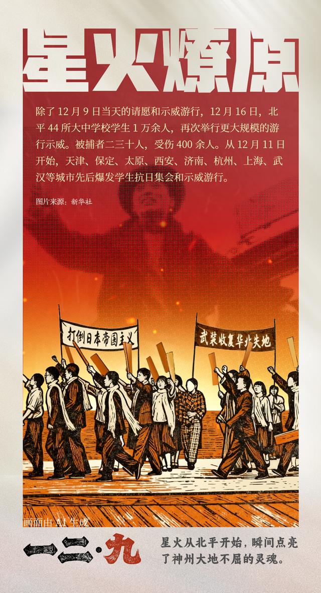 九一八事变之后,日本侵略者加快了蚕食中国领土的步伐。1935年,日本帝国主义不断侵犯我国华北地区,策动所谓华北五省“防共自治运动”,成立傀儡政权,遭到全国人民的坚决反对。1935年12月9日,北平(今北京)大中学校学生联合会(简称北平学联)领导数千名学生举行抗日救国示威游行运动,提出停止内战等6项要求。在中国共产党的领导和号召下,席卷全国的一二·九运动极大地促进了中国人民的觉醒,标志着中国人民抗日民主运动新高潮的到来。