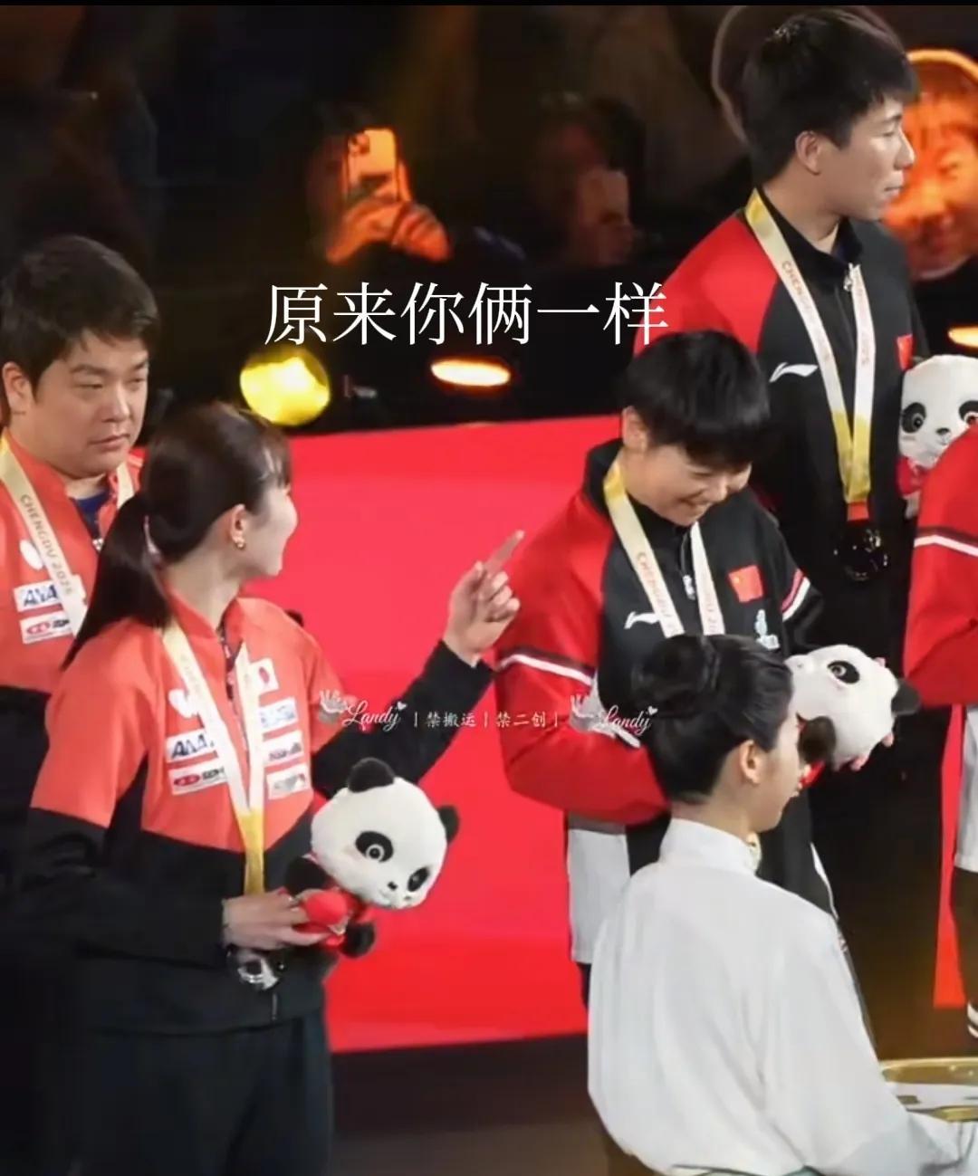 剑拔弩张的中日关系并未影响体育比赛的轻松与和谐,在乒乓球混团颁奖仪式上,早田希娜突然发现手中的吉祥物大熊猫的憨态可掬有点像孙颖莎,于是她提醒孙颖莎看看像不像,孙颖莎认真看了以后相视一笑,在激烈的比赛过后,这些少男少女恢复了她们本来的天性,也许这才是体育本身的魅力所在 友谊第一,比赛第二。但是相较于球员球场上的云淡风轻,观赛的日本网球却躁动不安,他们抱怨中国主场观众给了日本球员太大的压力。