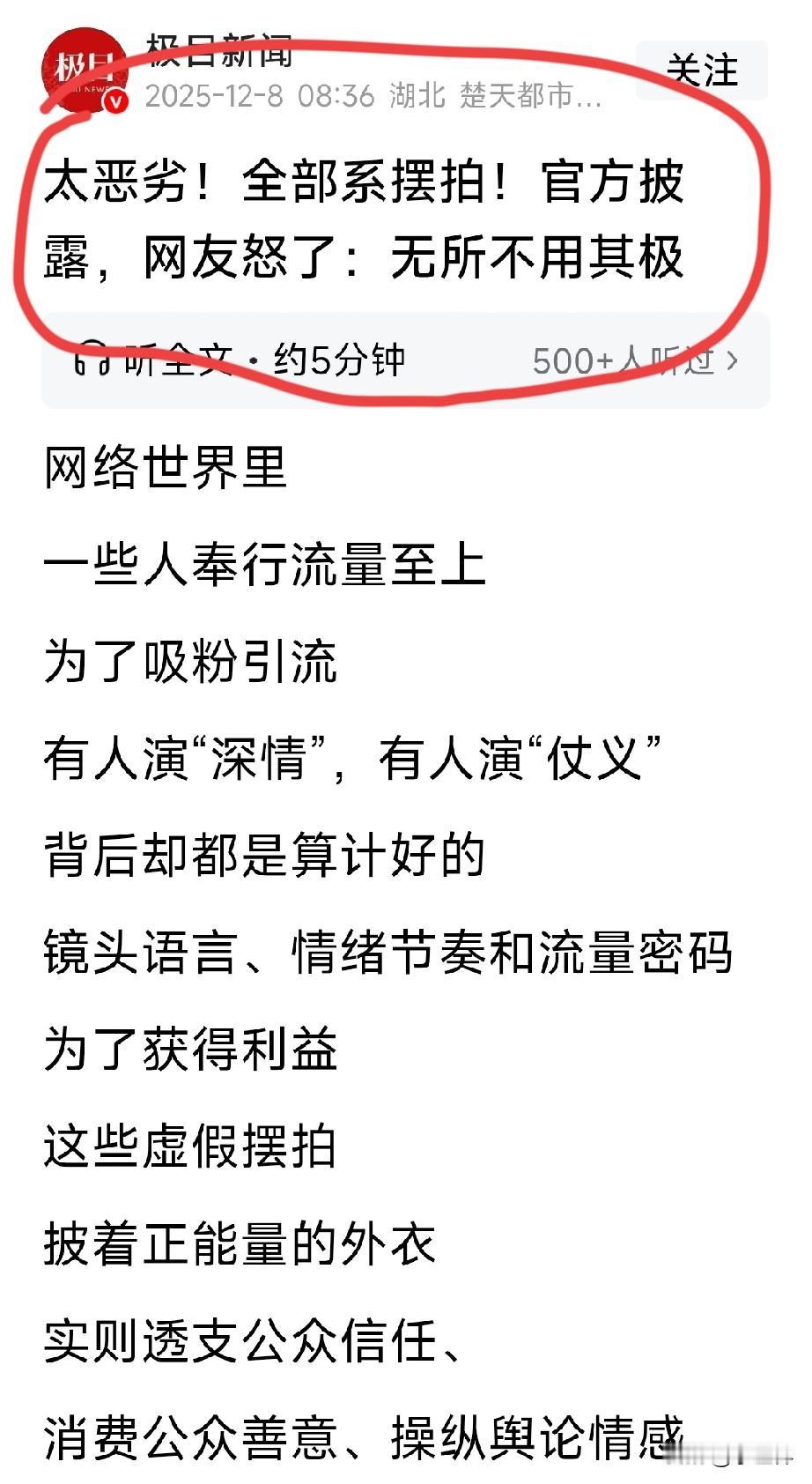 20万寻恩人竟是剧本杀!6人摆拍收割3000万流量,网友:善心禁不起消耗 “愿出20万重金,寻找救我性命的陌生恩人!”今年8月,主播“宋雨霏”的系列寻人视频戳中无数网友泪点,相关视频累计播放近3000万次,账号短时间暴涨8万粉丝。可12月7日央视披露的真相,让这场“知恩图报”的大戏沦为全网唾弃的骗局。 原来,这是宋某雪、何某龙等6人精心设计的流量陷阱。他们编造溺水获救的虚假剧情,连续拍摄11条系列视频,还炮制“拜访恩人母校”“遭遇勒索”等曲折情节,甚至远赴广西取景营造真实感。警方查处时,当场搜出19份拍摄脚本和道具清单,所谓“救命恩人”不过是团队成员扮演的角色,全程未标注“剧情演绎”,靠删评控评掩盖破绽。 最终,2名主犯被行政拘留,4名参与者被罚款。可这场骗局留下的伤害远不止于此:网友的同情心被当成引流工具,公众对“寻人求助”类信息的信任度被严重透支。就像网友怒斥的那样,这些人为了起号带货、牟取私利,简直无所不用其极。 如今,靠虚假剧情博流量的套路屡见不鲜。这些团队精准拿捏公众的道德共鸣,用逼真演技和细节渲染制造假象,却忘了网络从非法外之地。平台更该守好第一道防线,加强对剧情类视频的审核,要求明确标注虚构属性,不让虚假内容有可乘之机。 流量再诱人,也不能逾越法律和道德的底线。靠欺骗赚来的粉丝和收益,终究是镜花水月。希望这次处罚能敲响警钟,也提醒大家刷到类似求助视频时多留个心眼。只有守住真实的底线,网络空间才能少些套路,多些真诚。