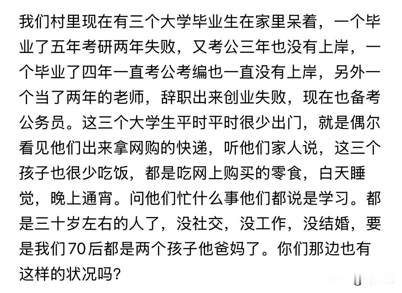 这是一位网友爆料村里三位大学生的事迹,看完之后,真是被惊讶到了。客观的说,一个村里出现三位这样疯狂执着考编的人也是罕见。考编考研别死磕,适当变通才现实,一直耗着太可惜了。 虽然追求稳定没错,但过度执着易陷入内耗。三十岁仍有试错机会,与其闭门死磕,不如适当停下调整状态,兼顾身心的同时灵活规划方向。 亲情期盼与自我追求需平衡,别让执念困住自己,踏实迈出脚步才会有新可能,真心希望这三位大学生能尽早醒悟……#寻美三湘# #长沙新朋友#