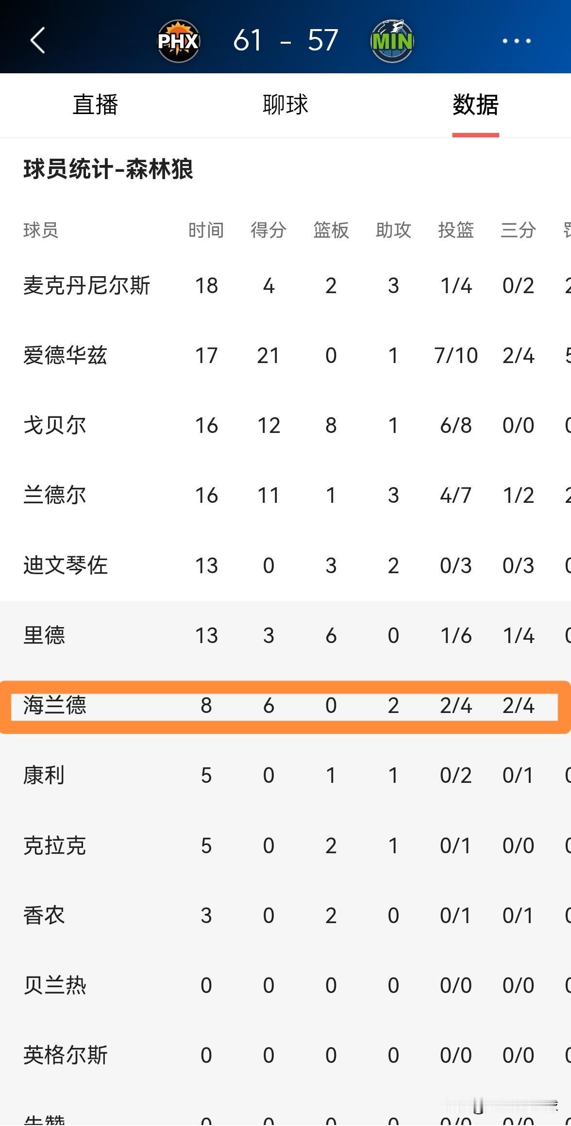 森林狼大将海兰德真是好样的!在今天森林狼主场迎战太阳的上半场比赛中,海兰德替补出战8分钟,三分球4中2得到6分2助攻0失误,他的场上正负值为+1。 坦白说,虽然海兰德的防守能力比较一般,但是他的进攻天赋还是非常出色的。就拿上半场比赛来看,海兰德在替补出战的8分钟里将自己出色的投射能力和组织能力展现的淋漓尽致。