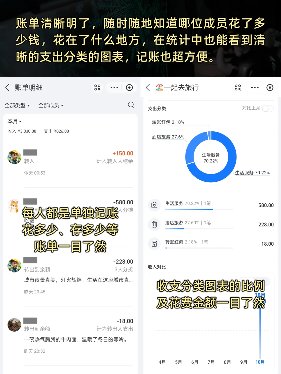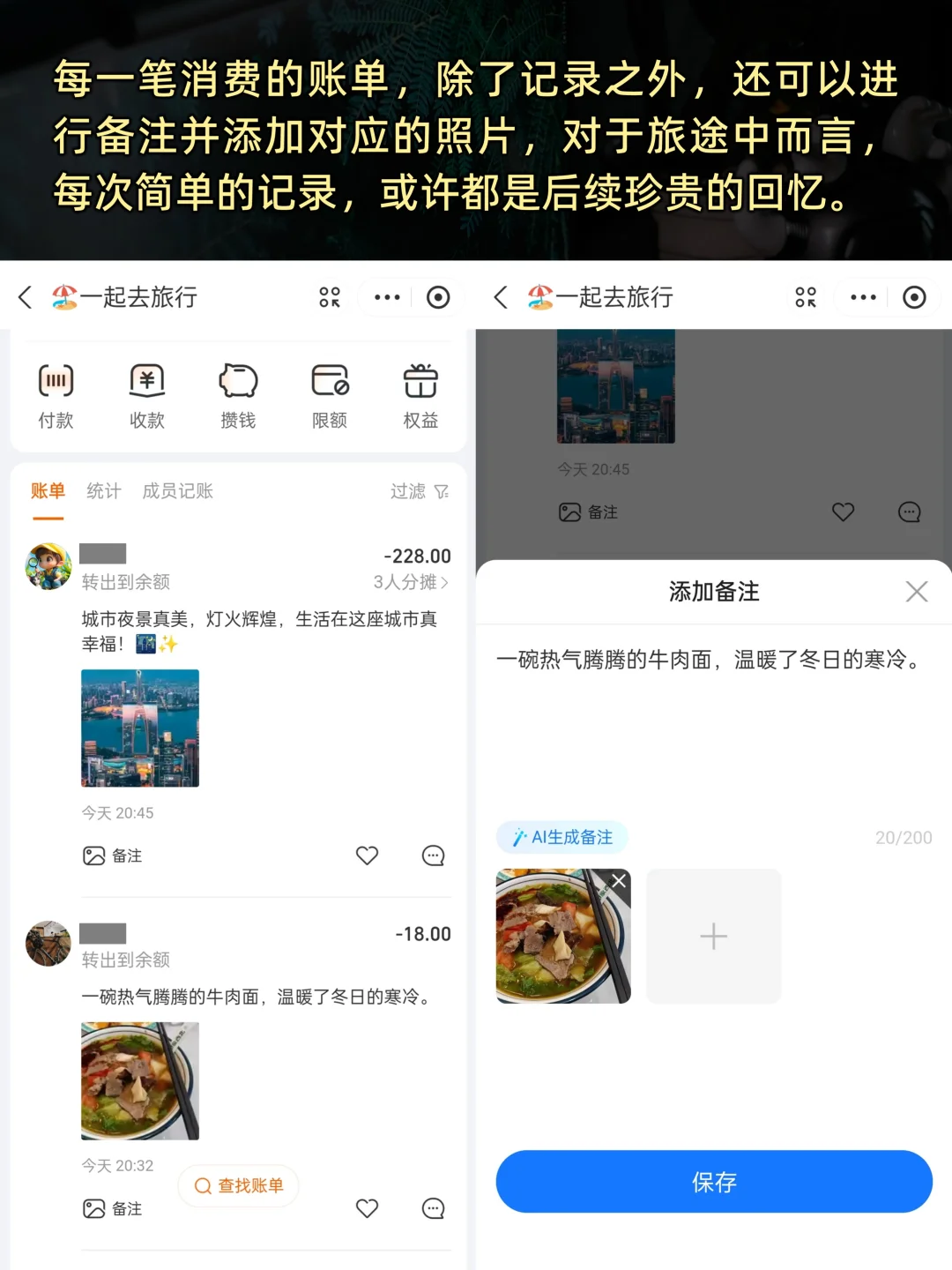 而且最省心的是账单相当透明,每笔开销都有标注,也可以备注添加照片,谁付的、花了多少,全员实时能看,再也不用怕记混账吃亏,也省去了自己记流水的麻烦(之前用记账app记到一半就摆烂了…)。