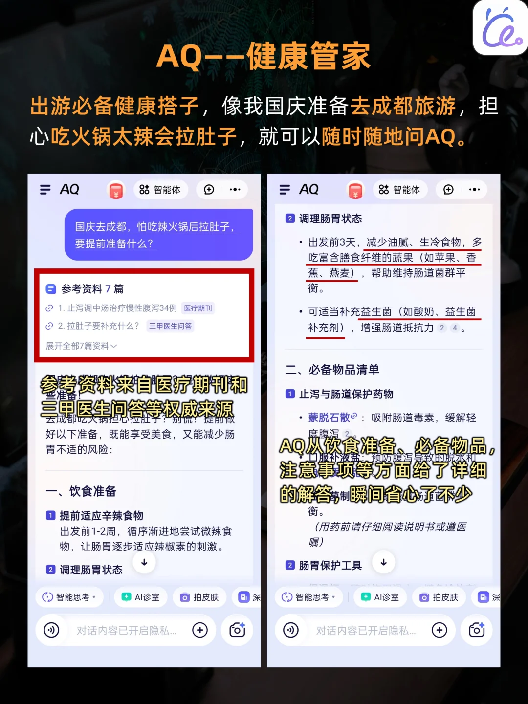 像我国庆准备去成都旅游,去之前就一直担心吃太辣了会拉肚子,现在直接问,不到 5秒就从饮食准备、必备物品,应急处理等方面给出解答,比如提前3天多吃蔬果,适当补充益生菌等;