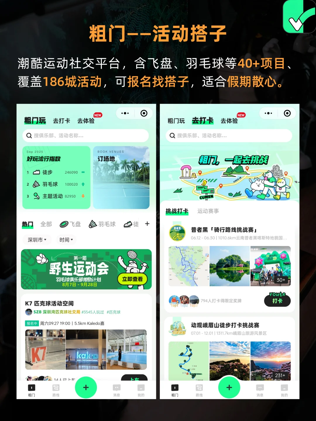 国内热门的潮酷运动社交平台,涵盖飞盘、羽毛球、骑行等 40 多个项目,在 186 个城市运营活动,能报名参与并结识搭子,适合假期不想挤景点又想散心的朋友。