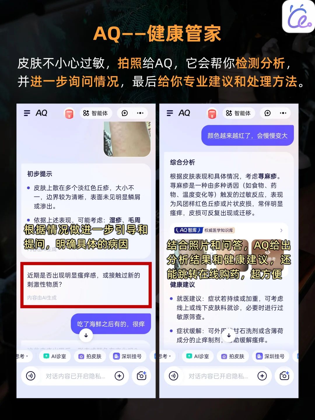 另外像吃海鲜后皮肤过敏,拍照给AQ,它还能帮你检测分析图片,并引导式地进一步询问情况,最后给你专业建议和处理方法。