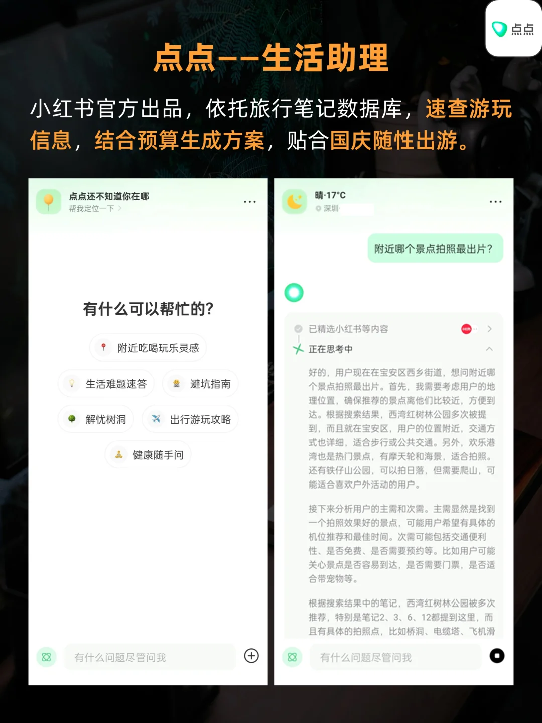 出品,依托平台旅行笔记数据库,景点路线、游玩时长、门票价格、特色美食、小众打卡点都能快速获取,还能结合时间预算生成方案,超贴合国庆随性出游需求。