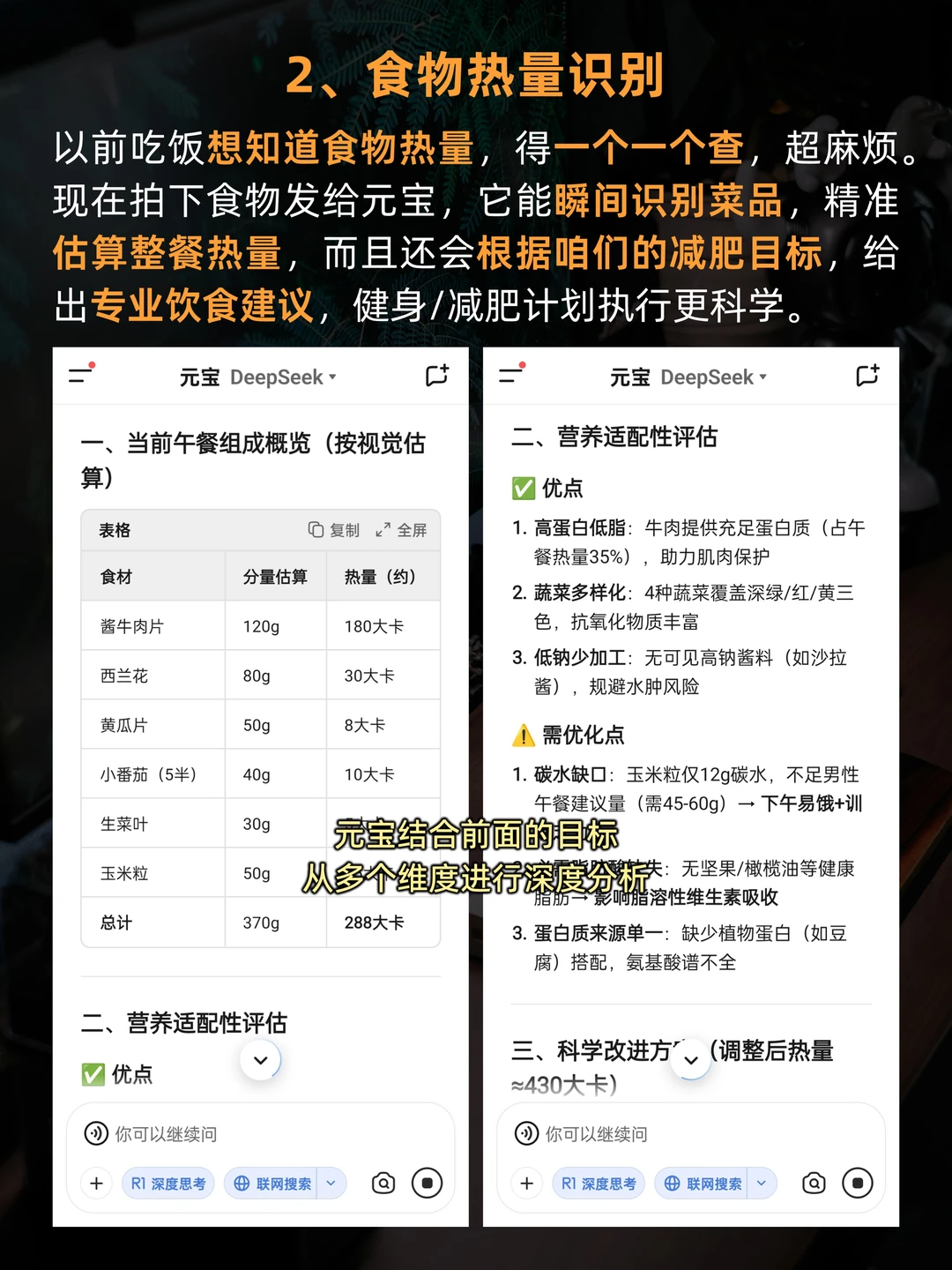 以前吃饭,想知道食物热量,得一个一个查,超麻烦。现在吃饭前,拍下餐盘里的食物发给元宝,它能瞬间识别出菜品,像米饭、鸡腿、青菜等,还能精准估算整餐热量。而且,它会根据咱们的身高、体重和减肥目标,给出专业饮食建议,减肥计划执行更科学。