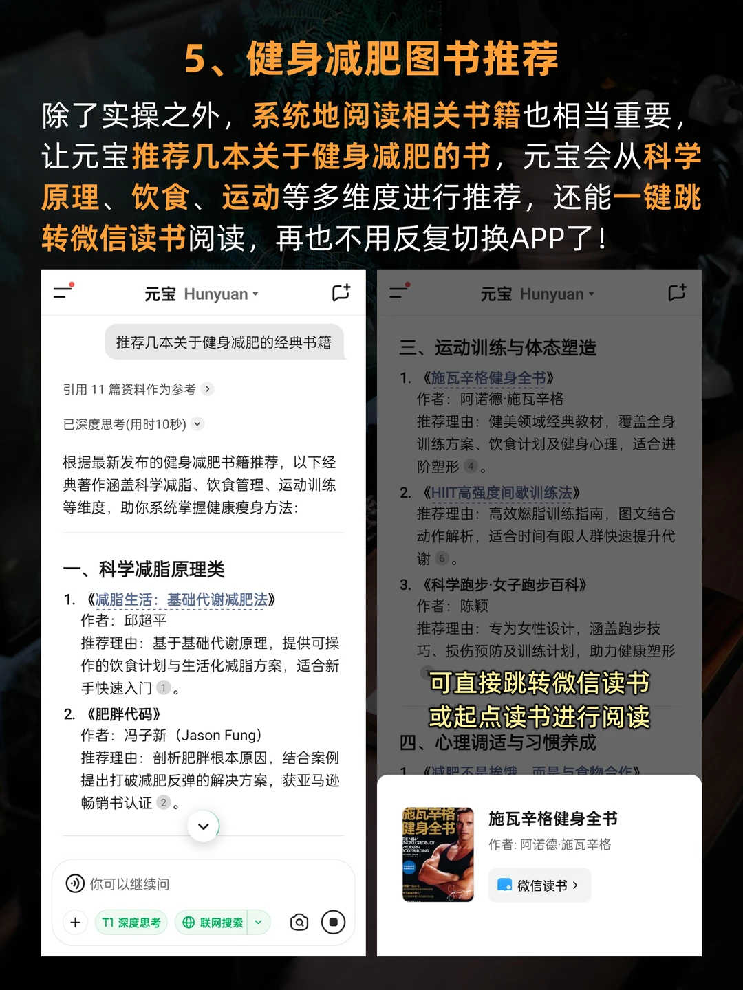除了实操之外,科学系统地阅读一些健身减肥的书籍,避免走弯路也相当重要,让元宝给你推荐几本关于健身减肥的书,元宝会从科学原理、饮食、运动等多维度进行搜索和推荐,推荐完还能点击一键跳转微信读书阅读,跨软件协作超丝滑,不用反复复制粘贴。