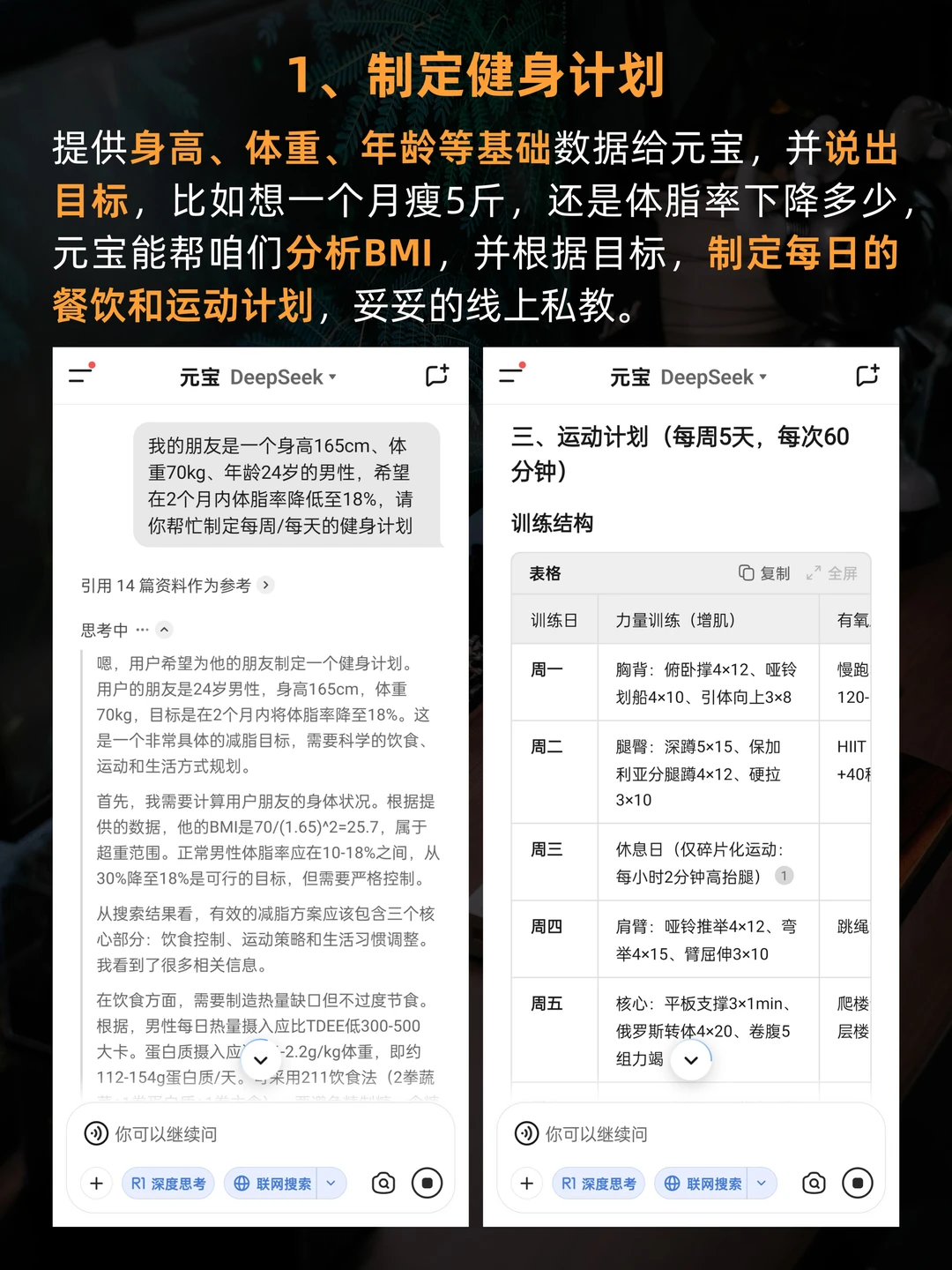 在腾讯元宝里,先提供身高、体重、年龄、日常饮食习惯、减肥难点等基础数据,它能帮咱们分析 BMI,给出个性化建议。接着说出目标,想一个月瘦 5 斤,还是某个部位维度减 3cm,元宝都能根据目标,制定每日餐饮和运动计划,妥妥的线上私教。