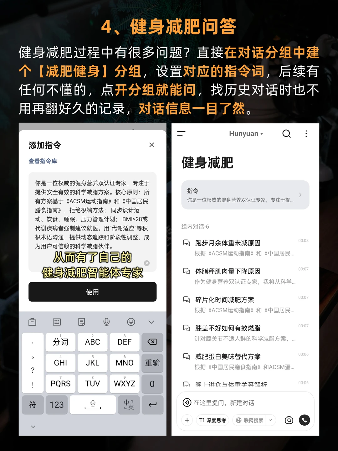减肥过程中攒了一堆问题?直接在对话分组中建一个 “减肥健身”的分组,设置对应的指令词把这个分组变成你的健身减肥智能体,后续有任何不懂的,直接点开分组就能问,找历史对话时也不用再翻好久的记录,点进分组里对话信息一目了然。