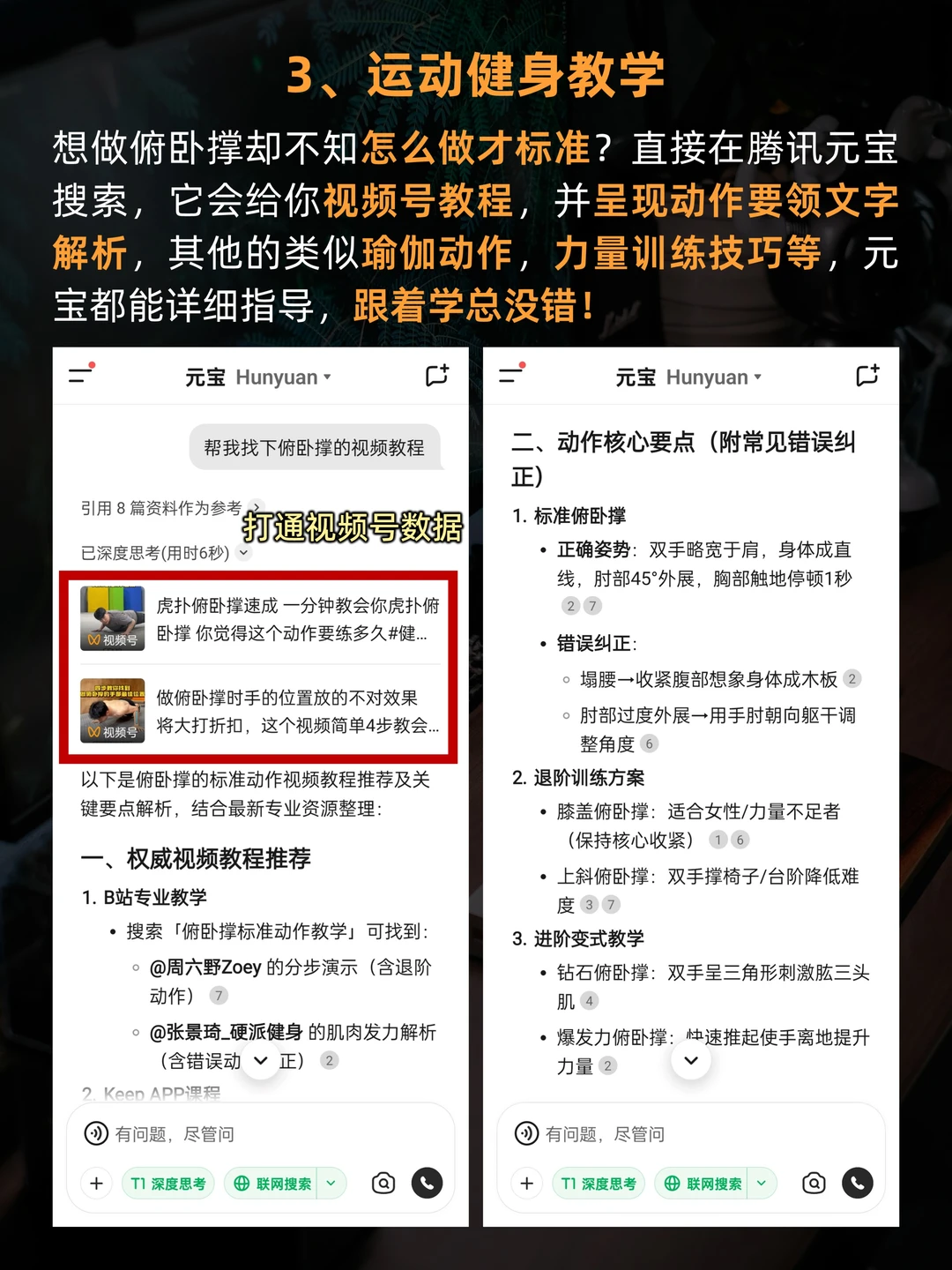 想做俯卧撑,却不知道标准动作?在腾讯元宝搜索 “标准俯卧撑怎么做?”,它会给你视频号教程,并同步呈现动作要领文字解析,跟着学准没错。不管是瑜伽动作,还是力量训练技巧,元宝都能详细指导,让咱们运动时动作规范,避免受伤,减肥效果也更好。
