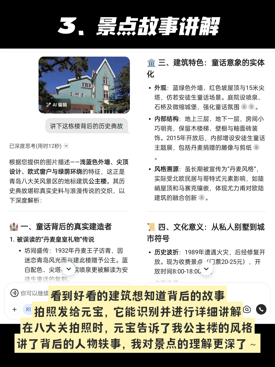 到了景点看到好看的建筑、雕塑想了解背后故事,拍张照发给元宝,它能识别出来并详细讲解。在八大关拍公主楼时,元宝告诉我这是丹麦式风格,还讲了曾经居住在这里的人物轶事,让我对景点的理解更深刻了。