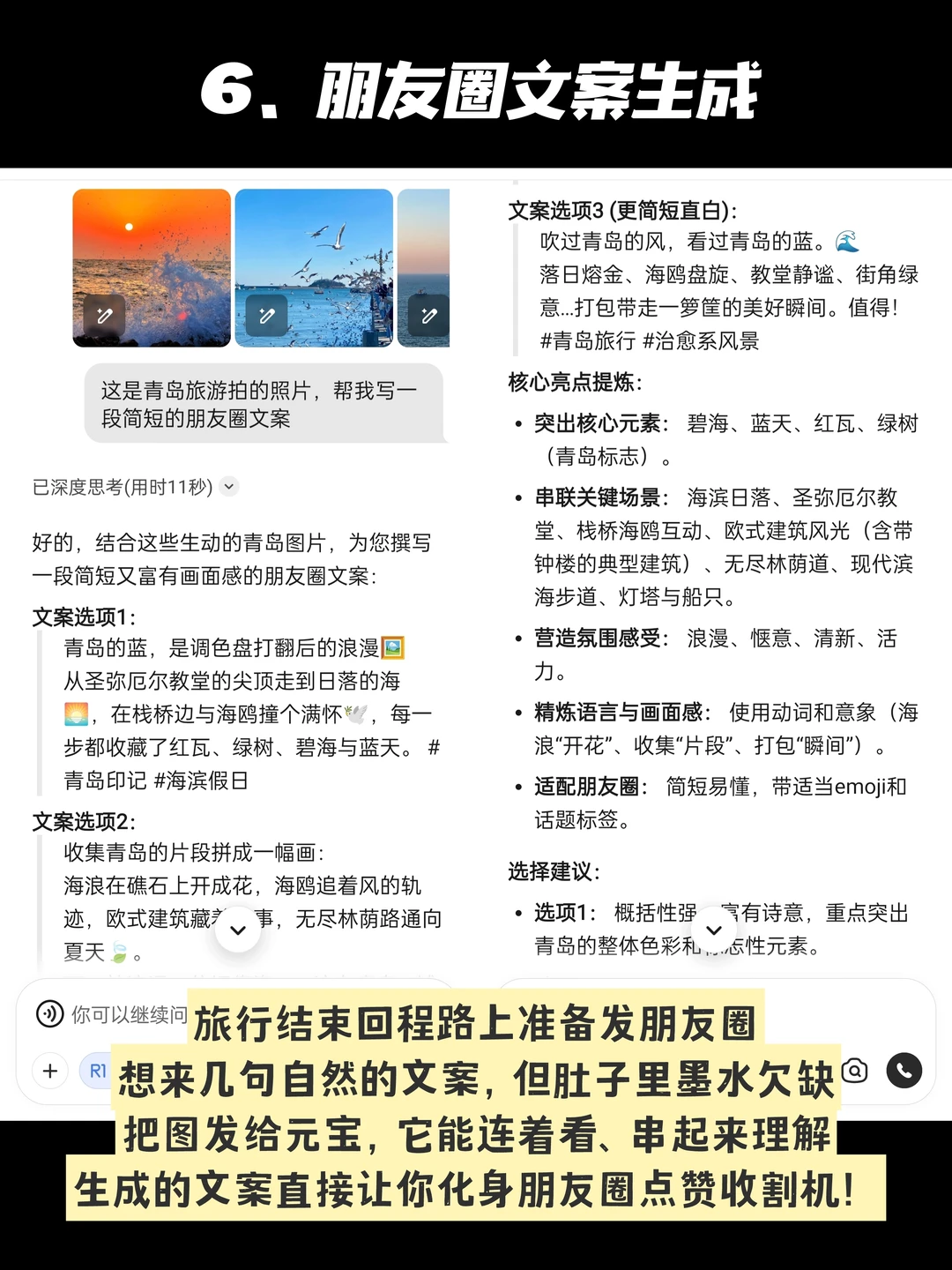 旅行结束回程路上,拍了很多照片准备发朋友圈,想来几句自然的文案,但自己的肚子墨水欠缺,直接把图片发送给元宝,不论选混元还是DeepSeek,元宝能连着看、串起来理解、集中回答,生成的文案直接让你化身朋友圈点赞收割机!