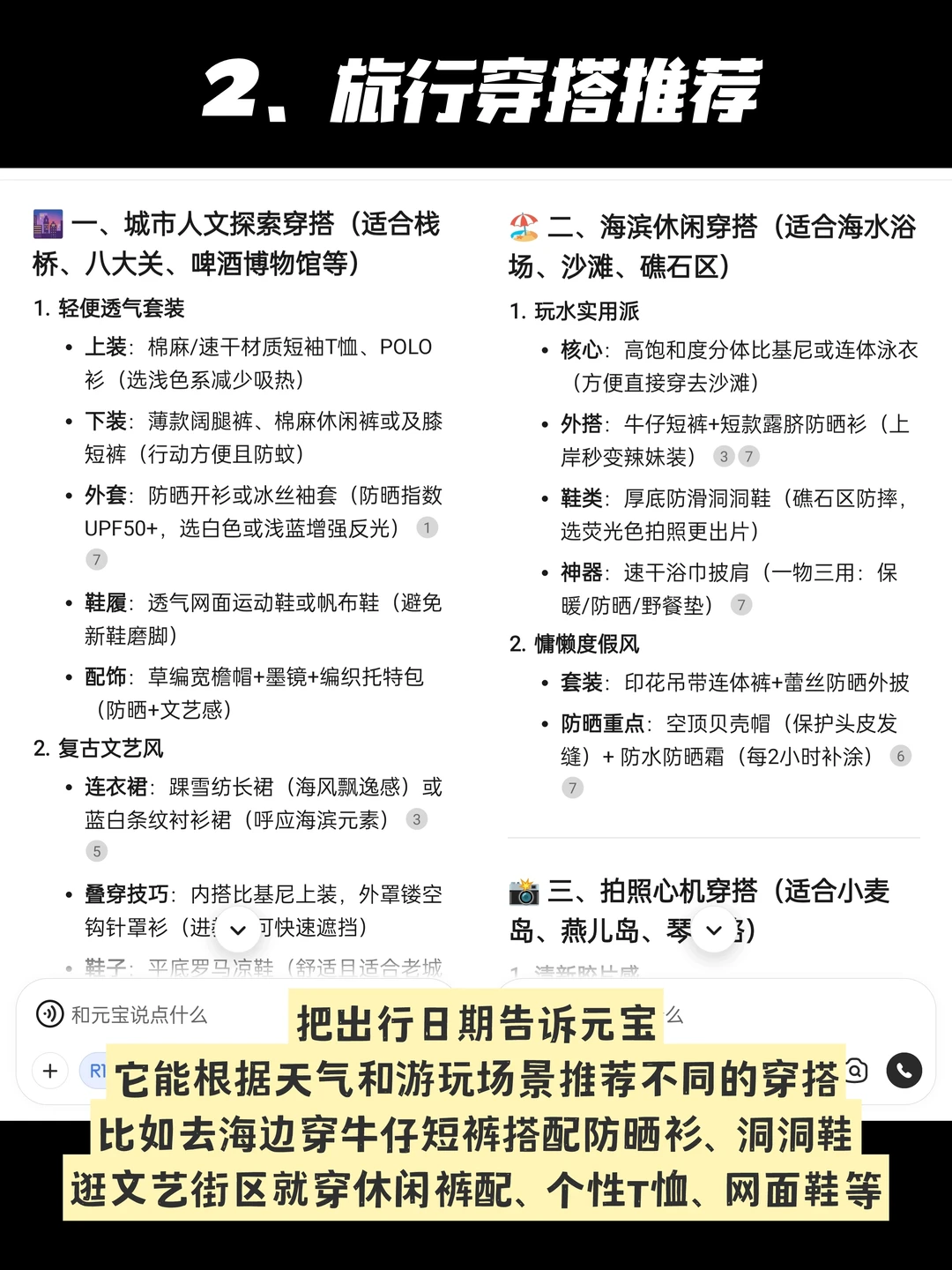 出发前为带什么衣服发愁,我直接把出行日期告诉元宝,它就能根据天气和游玩场景推荐不同风格的穿搭,比如去海边穿牛仔短裤搭配露脐防晒衫、防滑洞洞鞋;逛文艺街区就穿棉麻休闲裤配个性T恤、透气网面鞋。